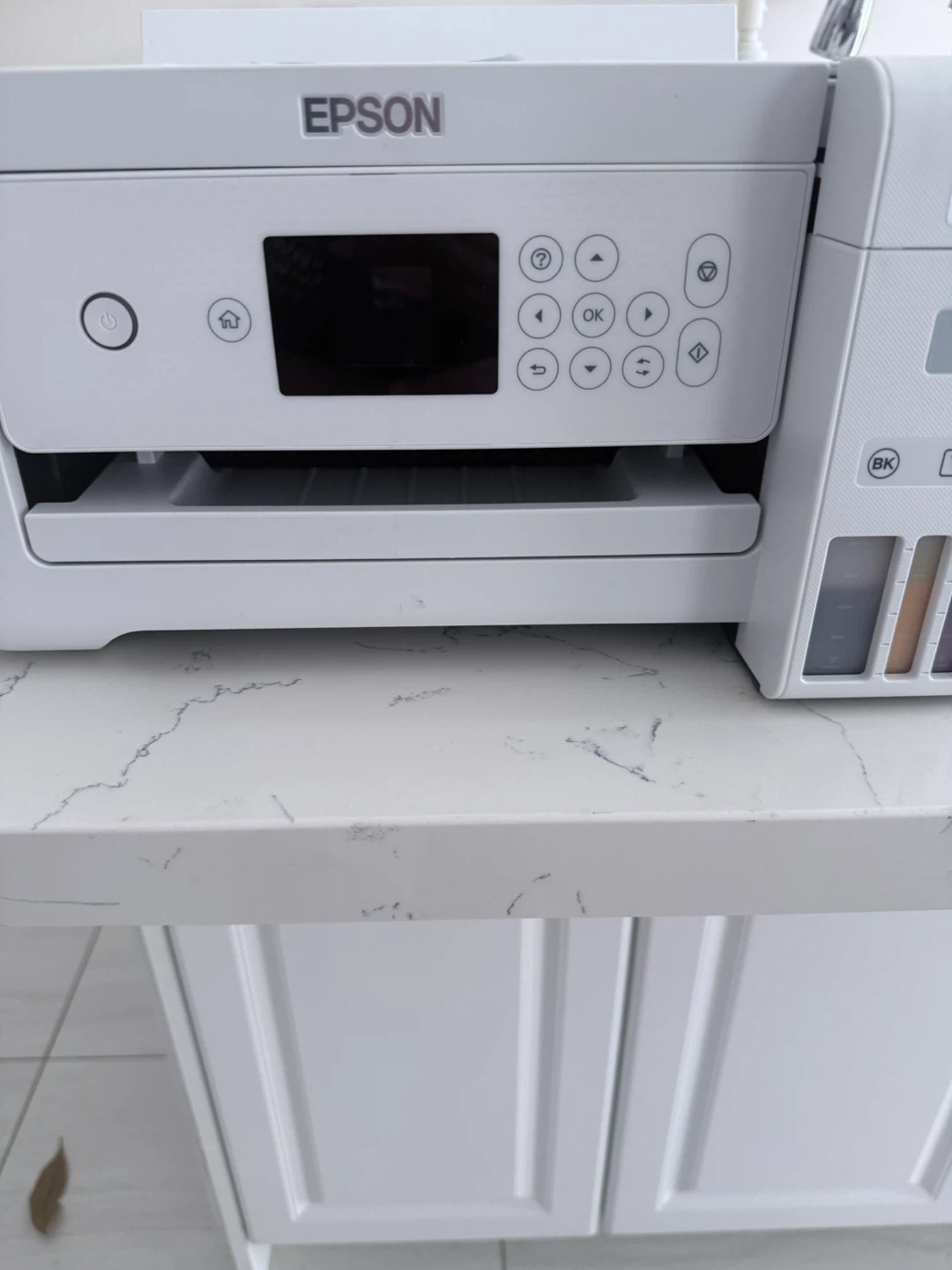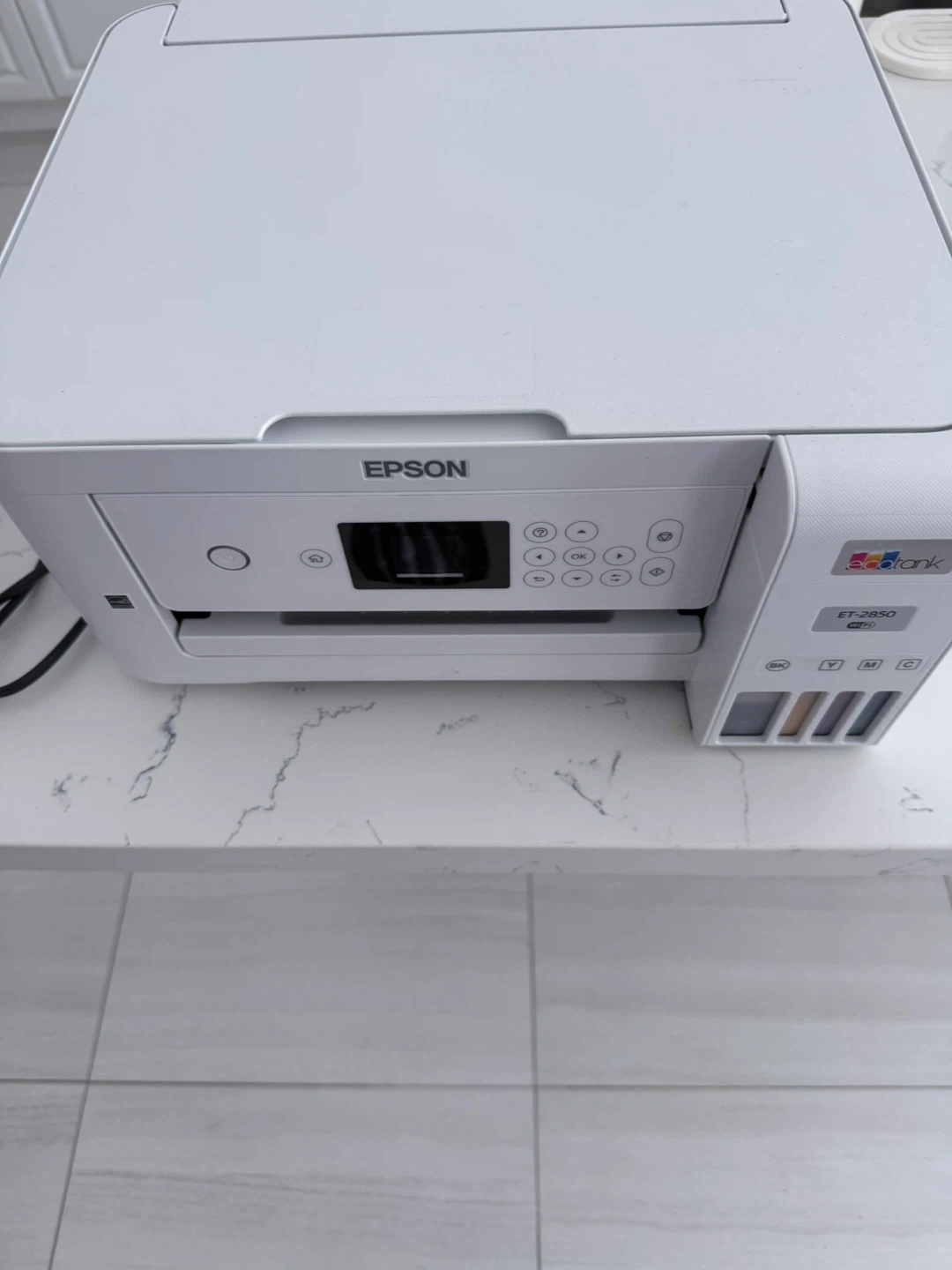 This is an Epson EcoTank ET-2850 all-in-one printer. It's a white model with a built-in scanner and copier. The EcoTank system uses ink bottles for refilling.