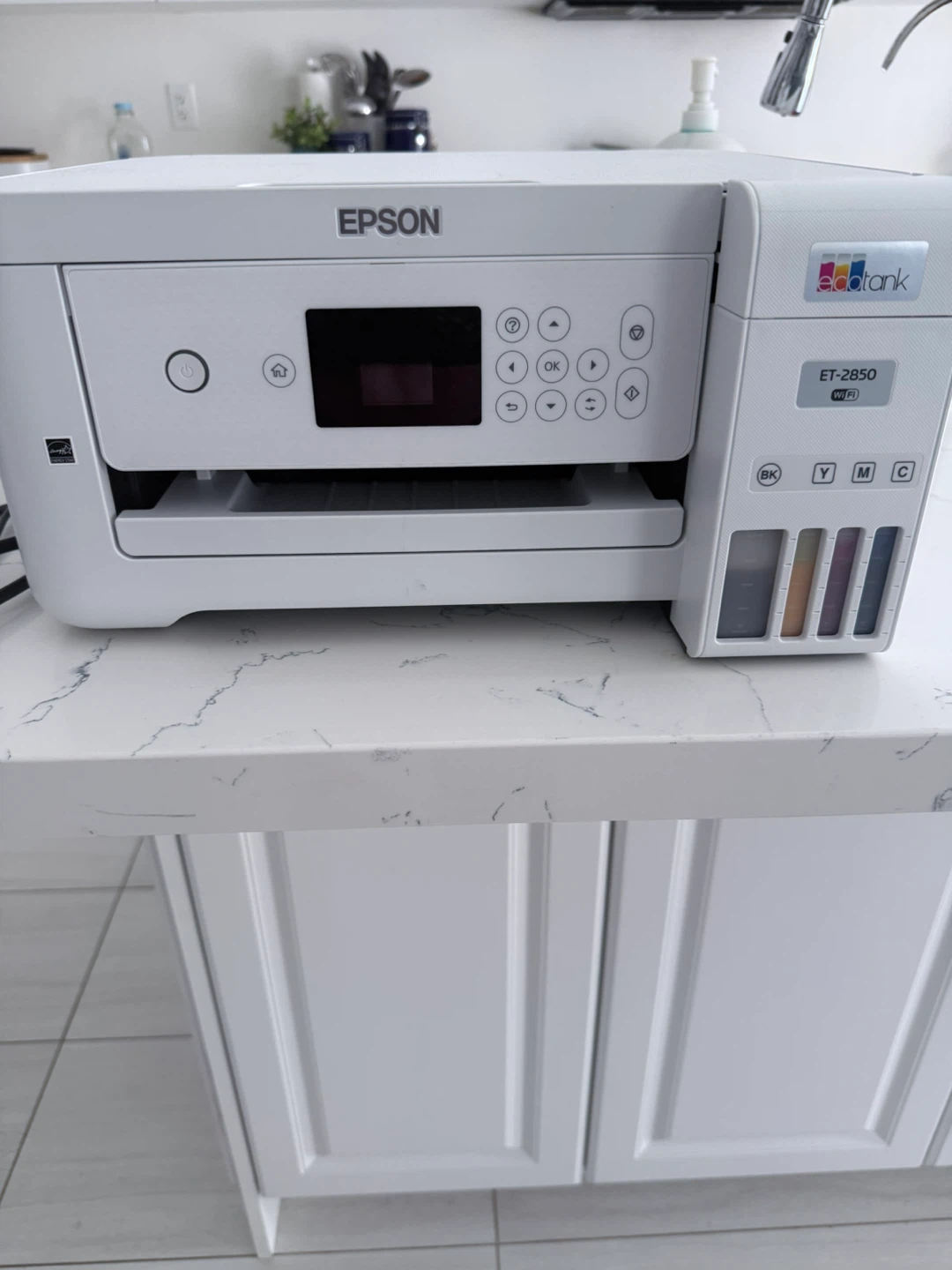 This is an Epson EcoTank ET-2850 all-in-one printer. It's a white model with a built-in scanner and copier. The EcoTank system uses ink bottles for refilling.