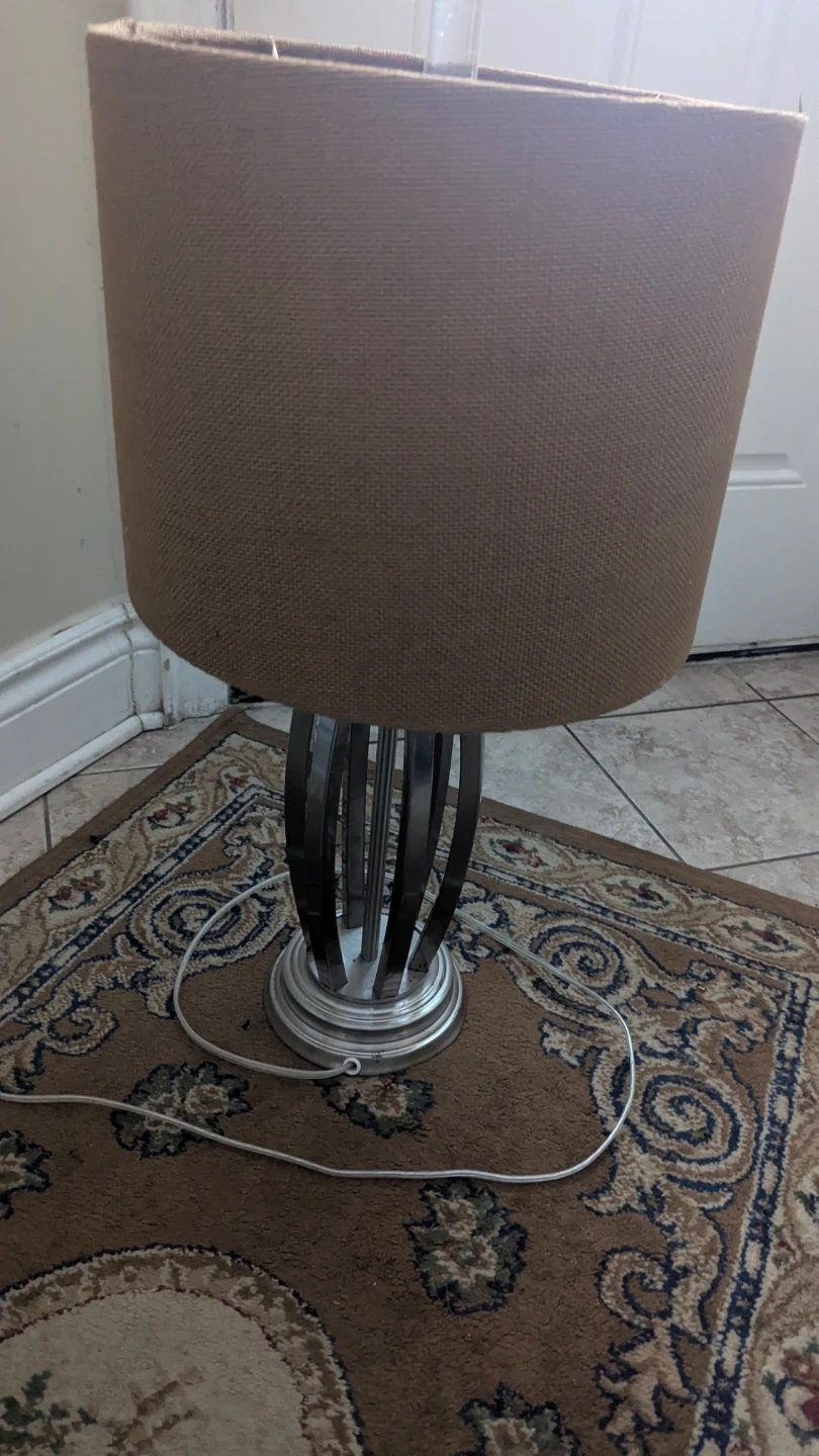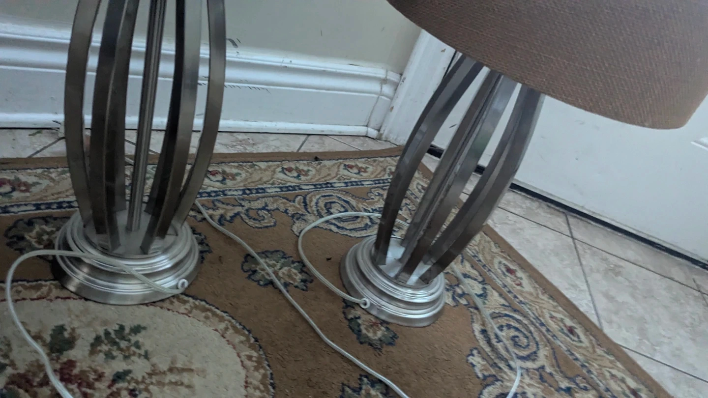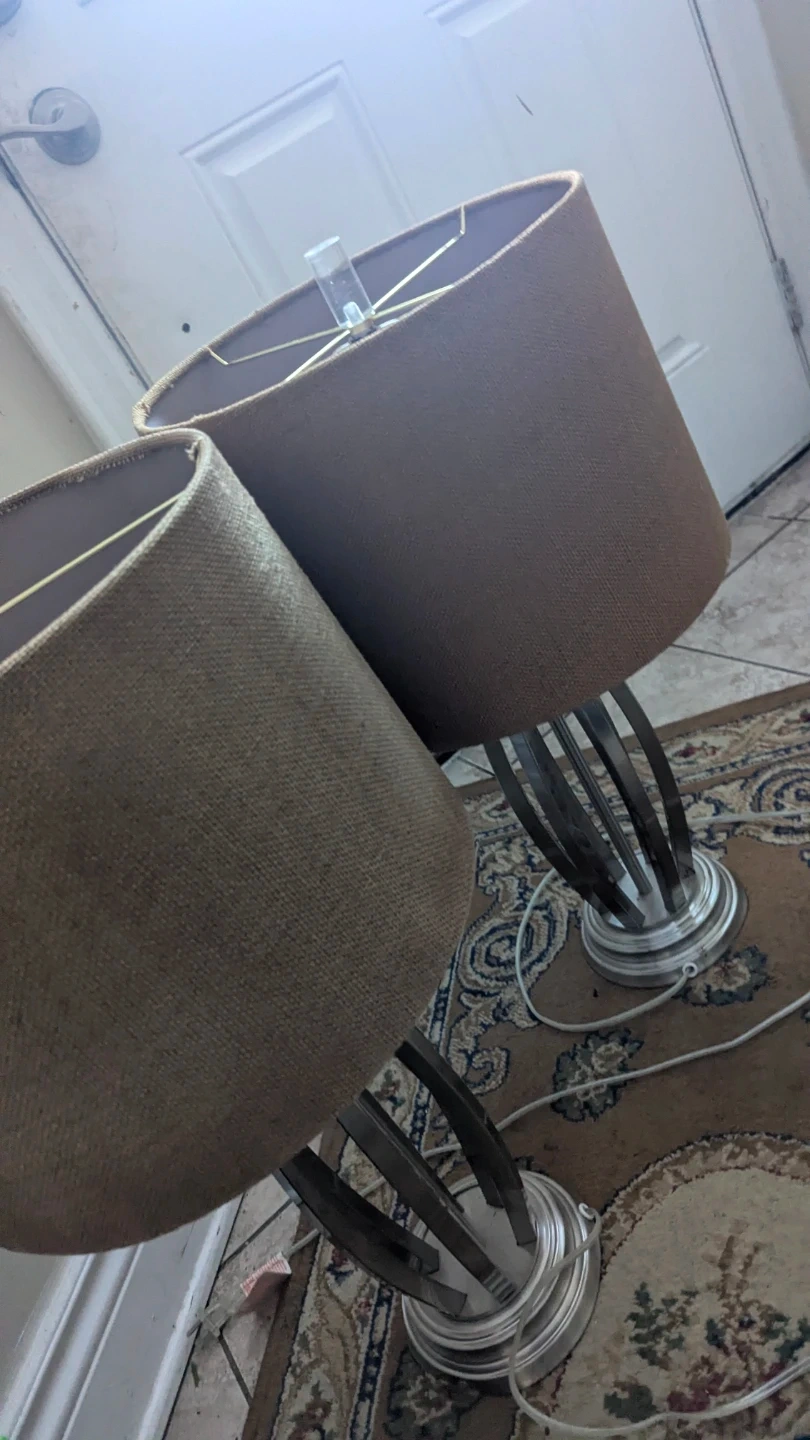Stylish set of two metal table lamps. Each lamp features a brushed metal base with an artistic curved design and a neutral tan fabric shade. They're a great addition to any living room or bedroom!