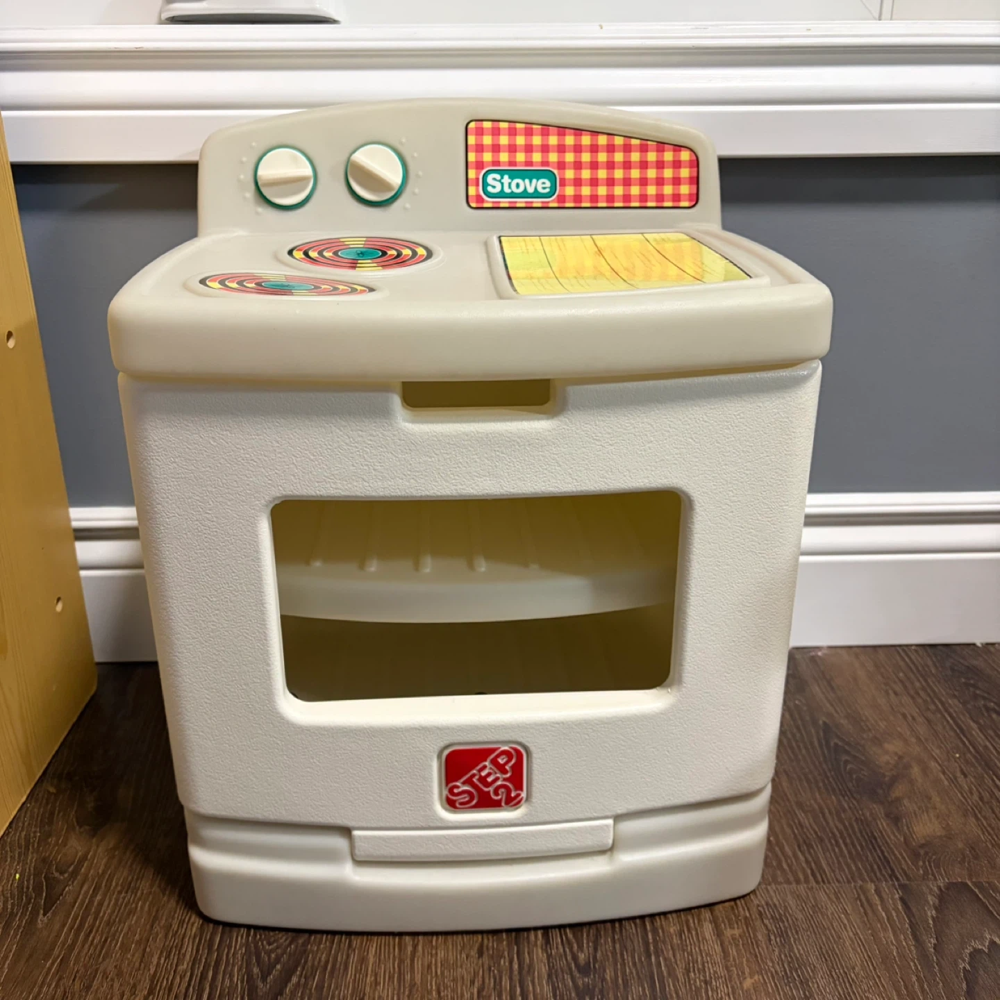 Cream-coloured Step 2 toy stove for kids. It's got two burners on top and an oven below. This makes for a fun imaginative play experience! Vintage
