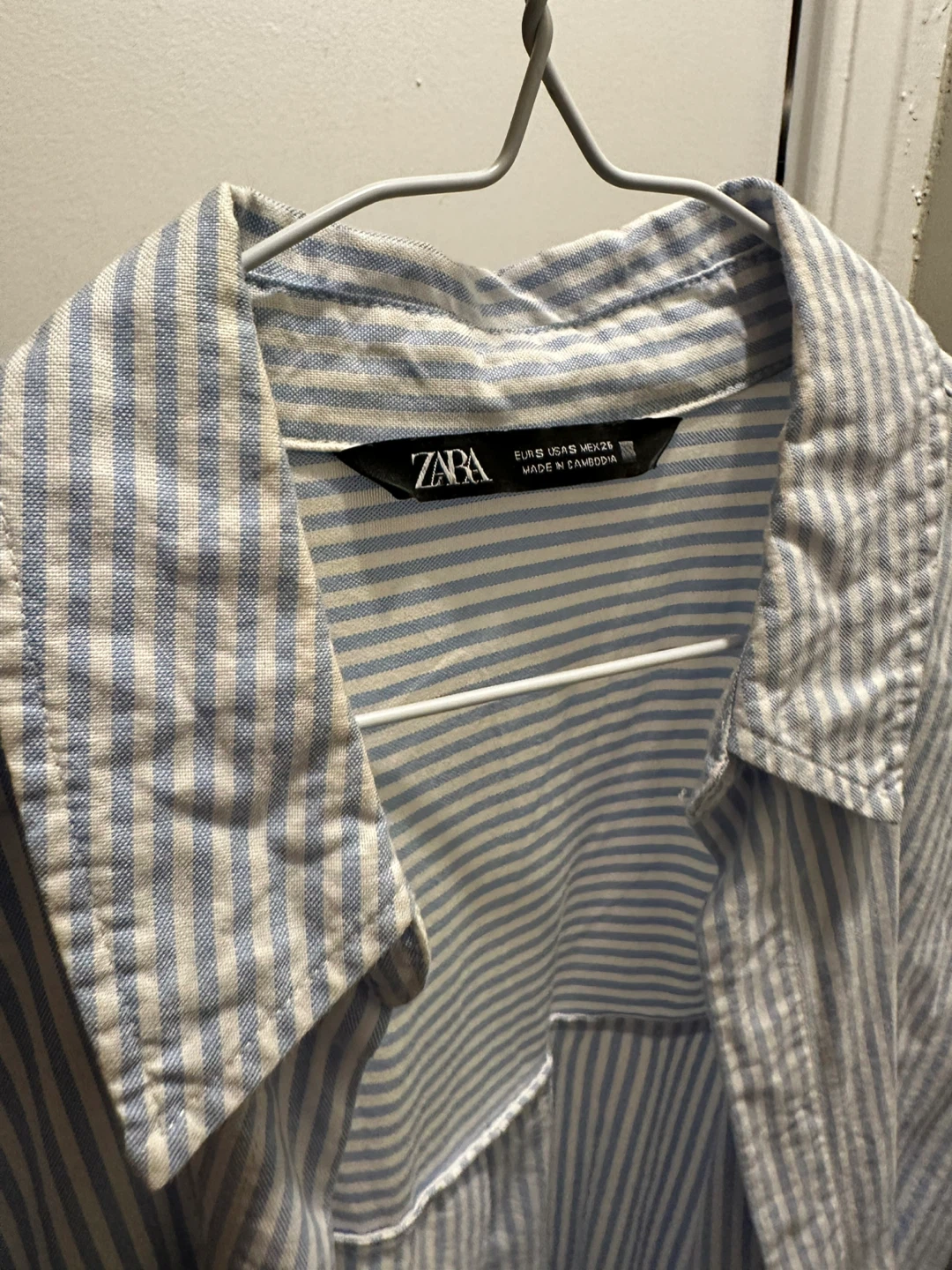 Declutter. Zara striped button-up shirt. It's a size S and features a classic blue and white stripe pattern.