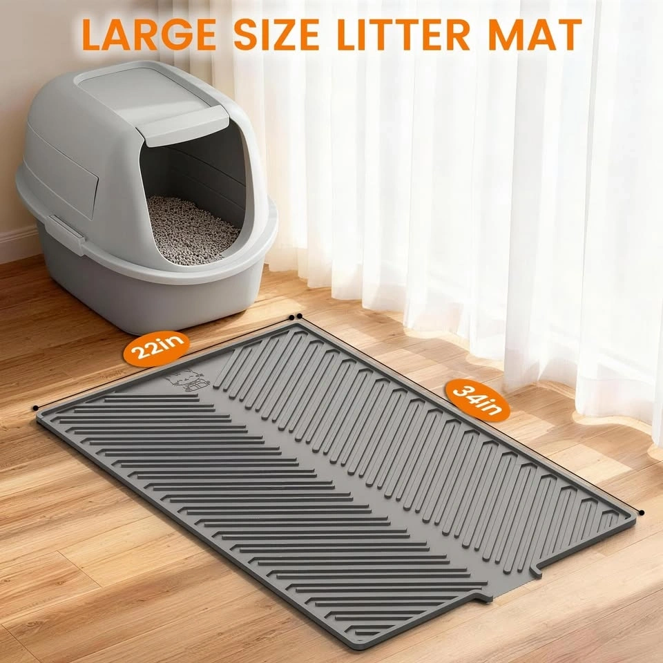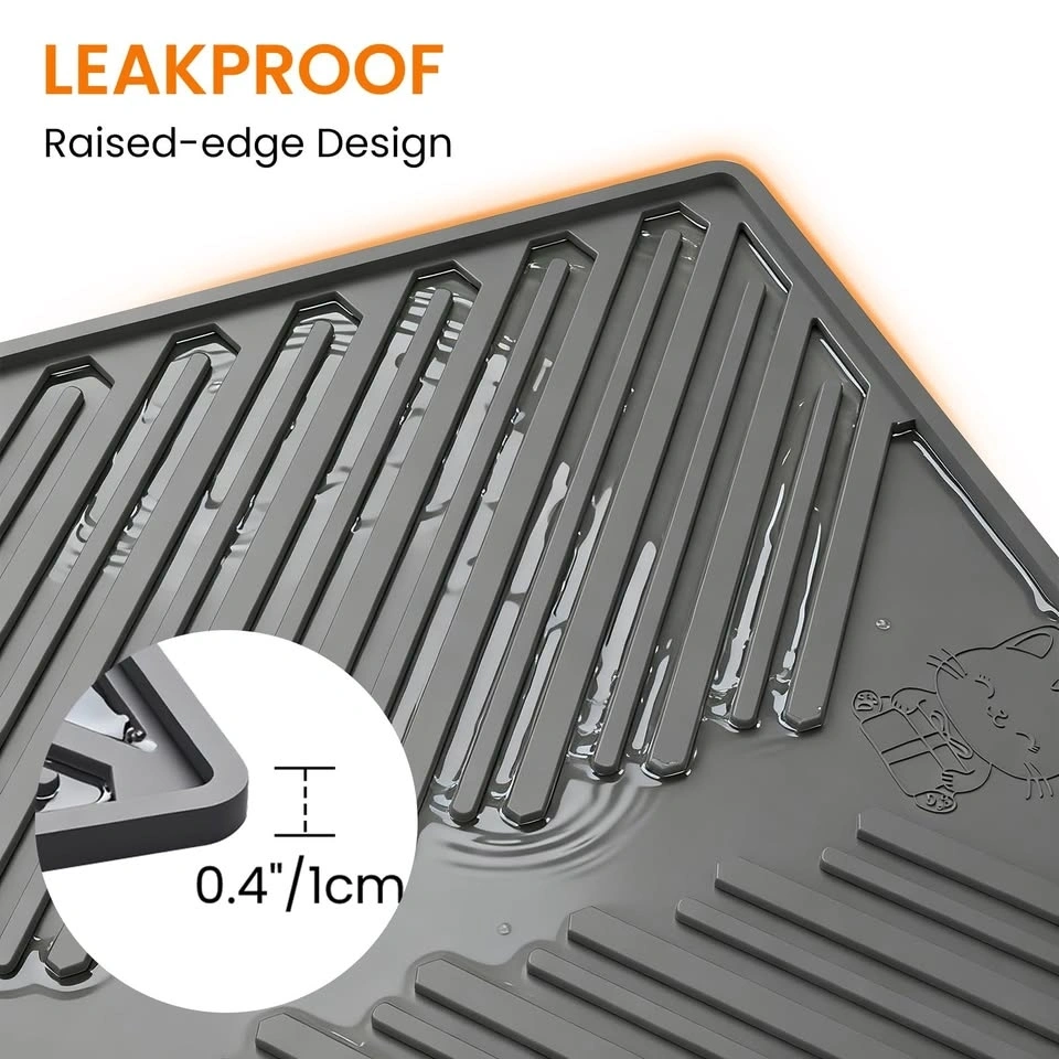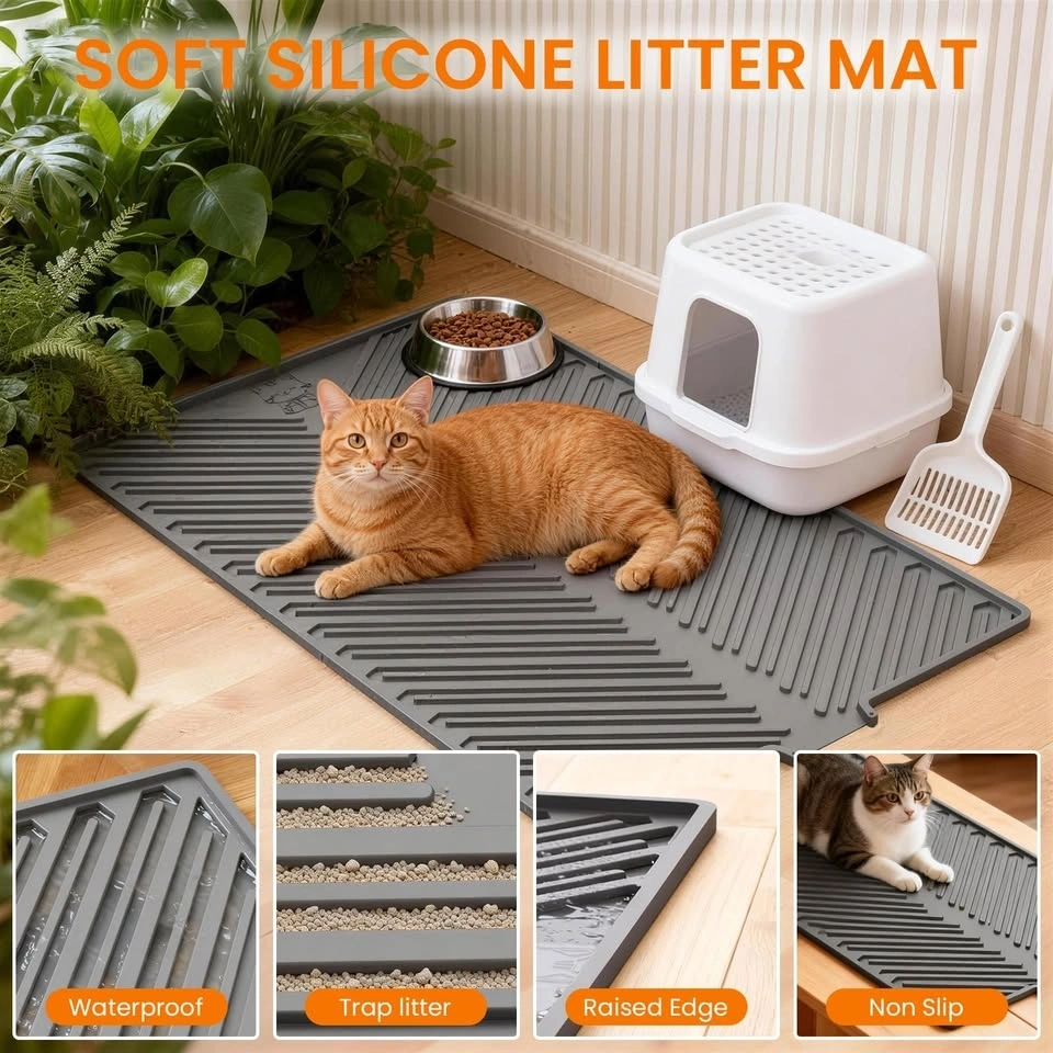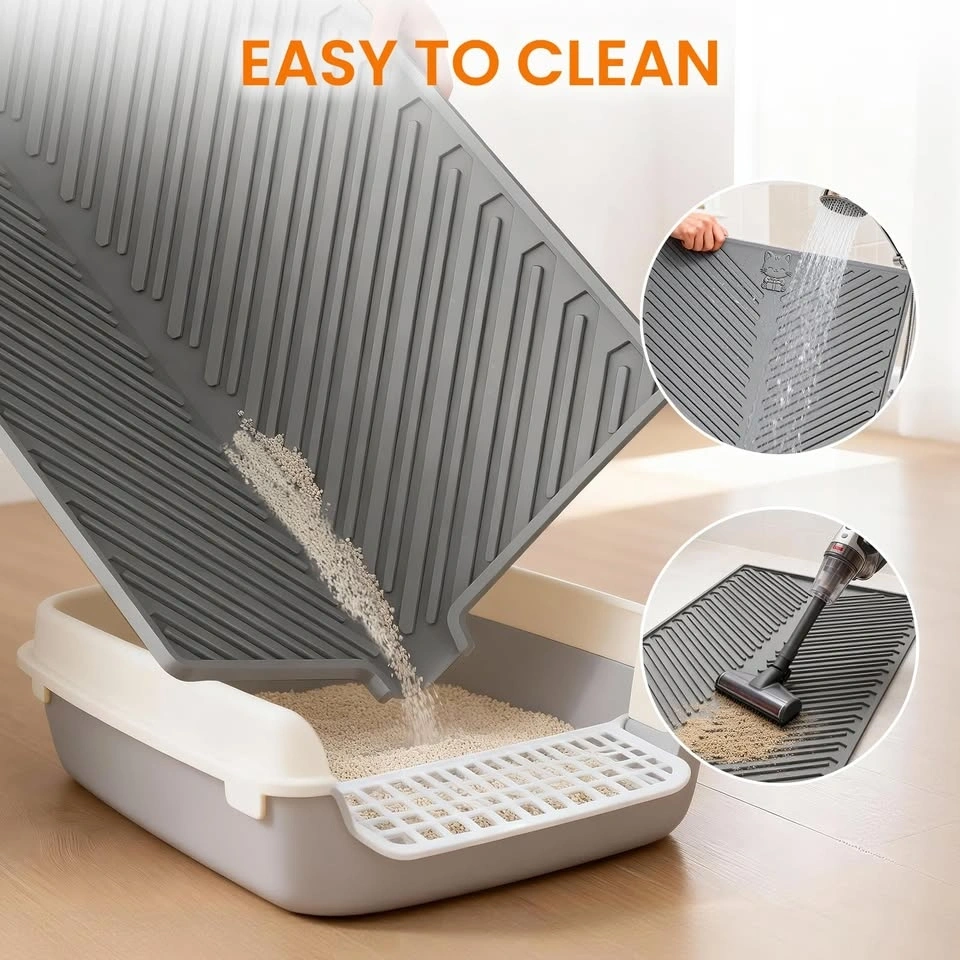Soft silicone litter mat with deep grooves to trap litter and keep your home cleaner. Waterproof and non-slip design. Super easy to clean, just rinse or vacuum. Raised edge helps contain any mess.
