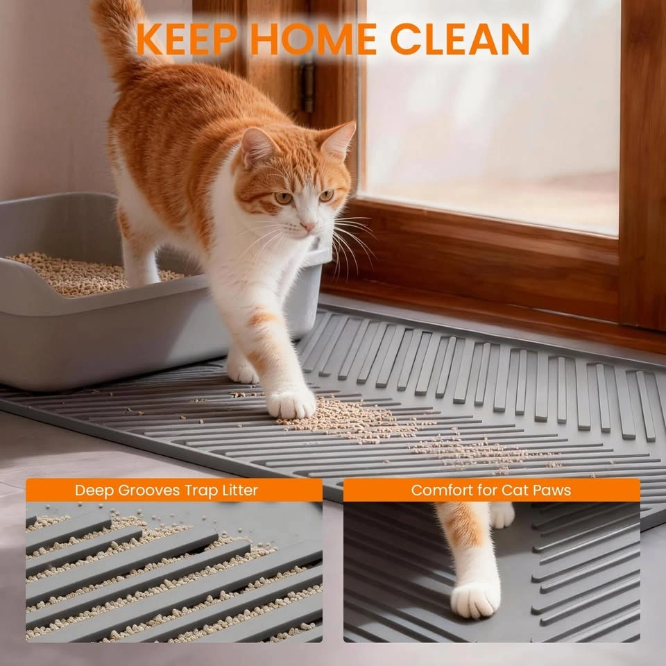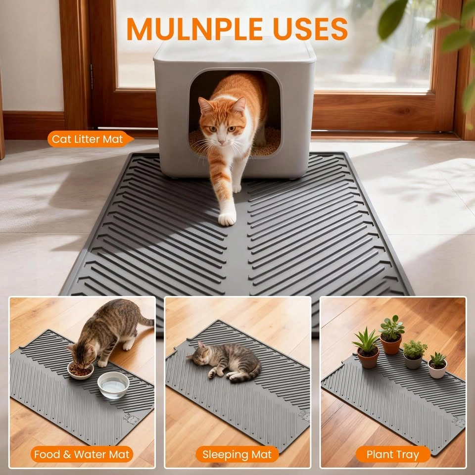 Soft silicone litter mat with deep grooves to trap litter and keep your home cleaner. Waterproof and non-slip design. Super easy to clean, just rinse or vacuum. Raised edge helps contain any mess.
