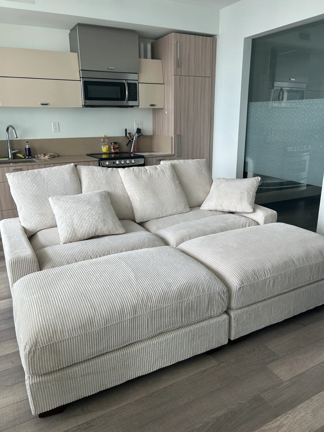 Comfy cream corduroy sectional sofa. It's made with soft corduroy fabric and includes multiple cushions. This sofa is perfect for lounging in your living room!