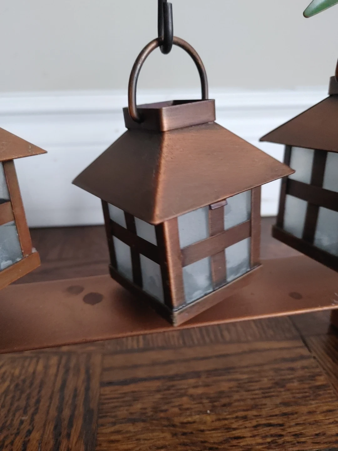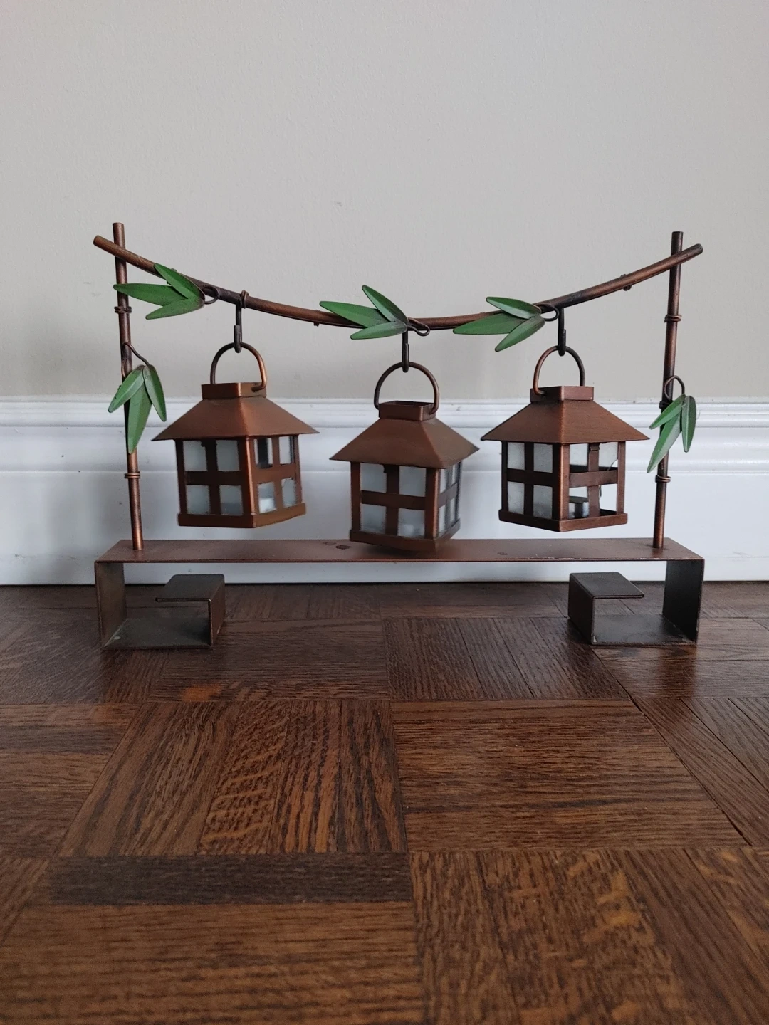 This decorative set includes three copper-coloured lanterns, each with glass panels. (Glass missing from one panel) They hang from a metal branch design with faux bamboo leaves. Each lantern has a metal roof that lifts for candle access.