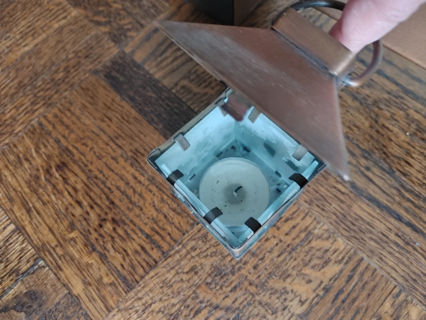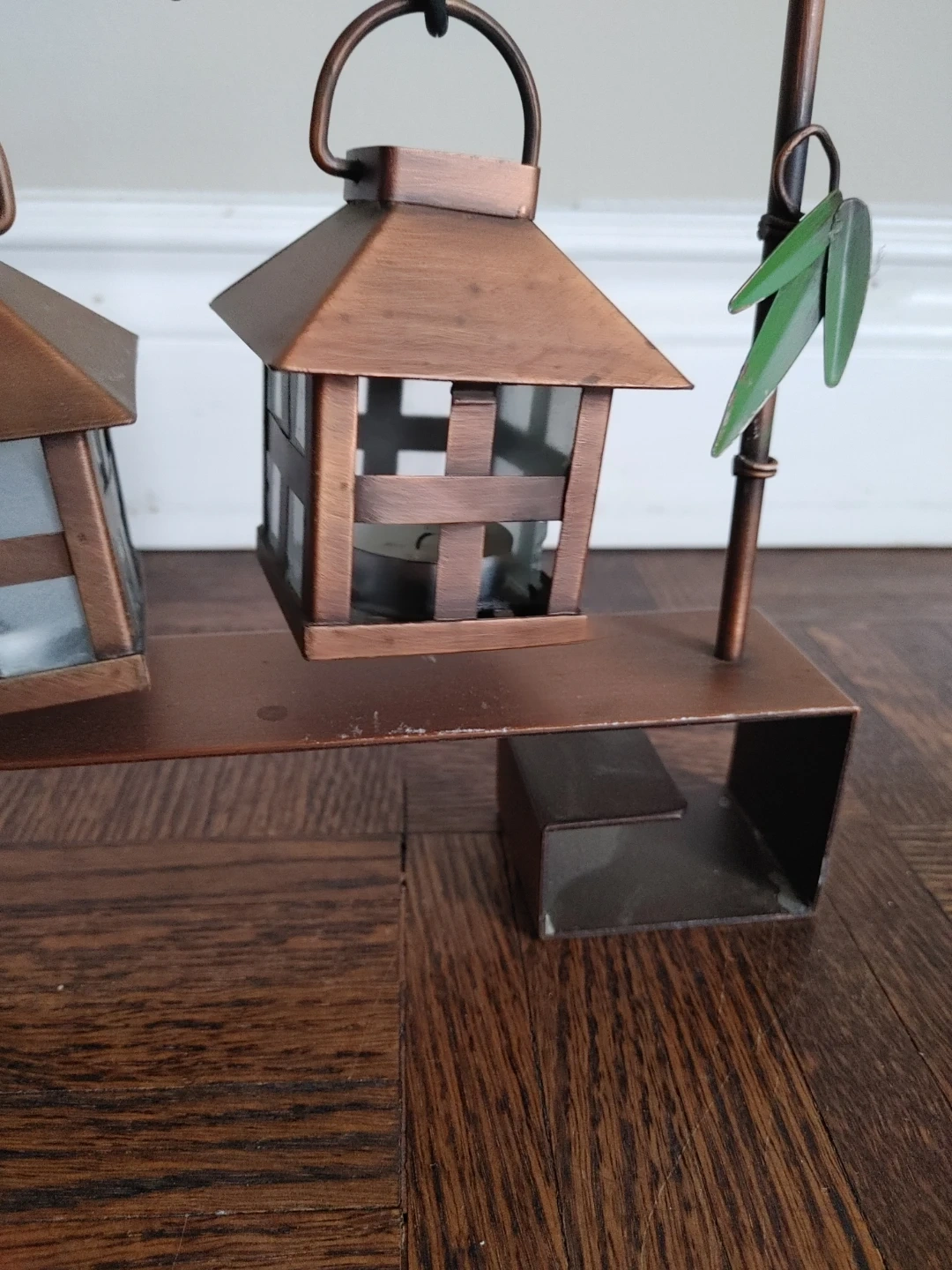 This decorative set includes three copper-coloured lanterns, each with glass panels. (Glass missing from one panel) They hang from a metal branch design with faux bamboo leaves. Each lantern has a metal roof that lifts for candle access.