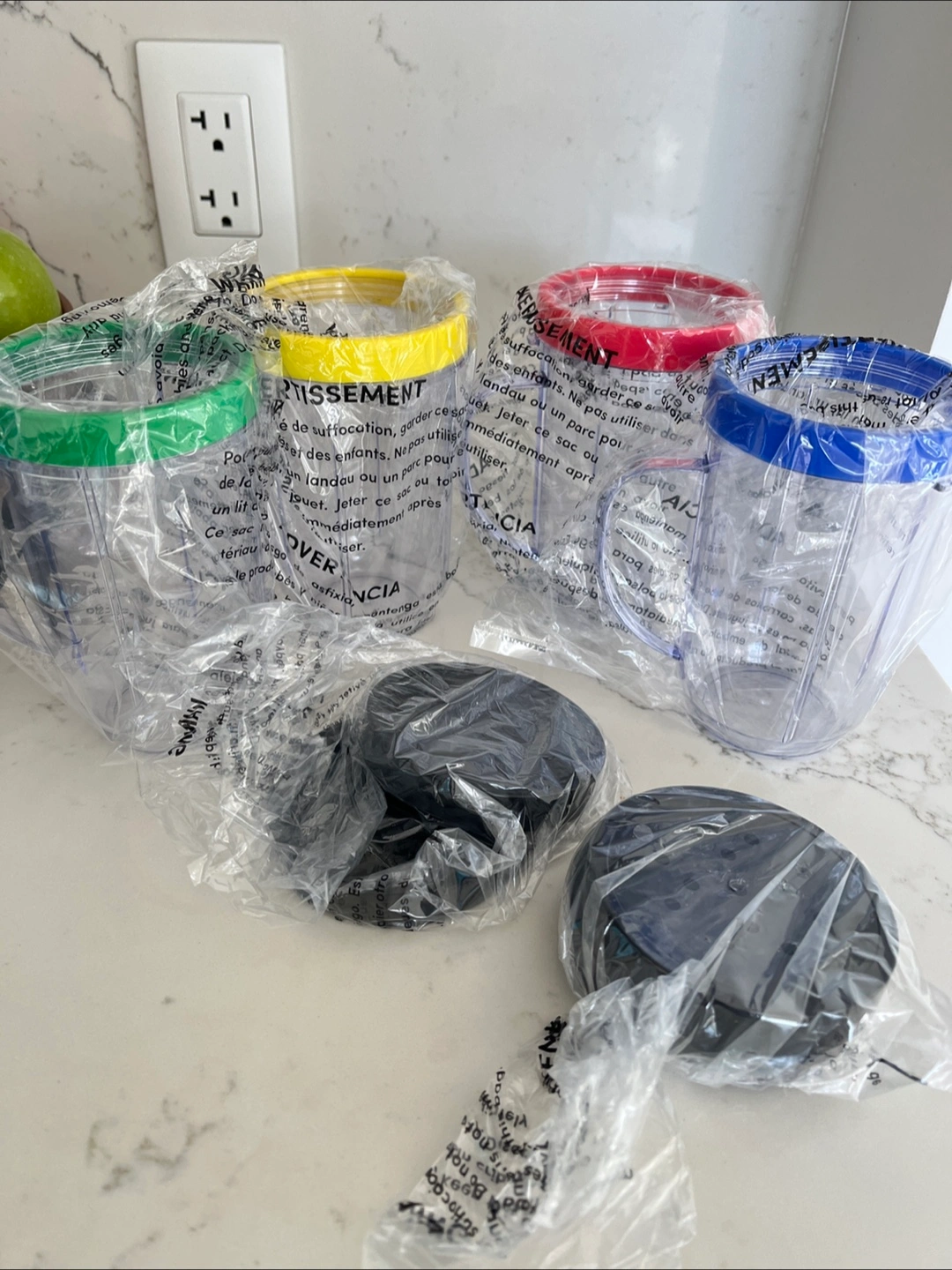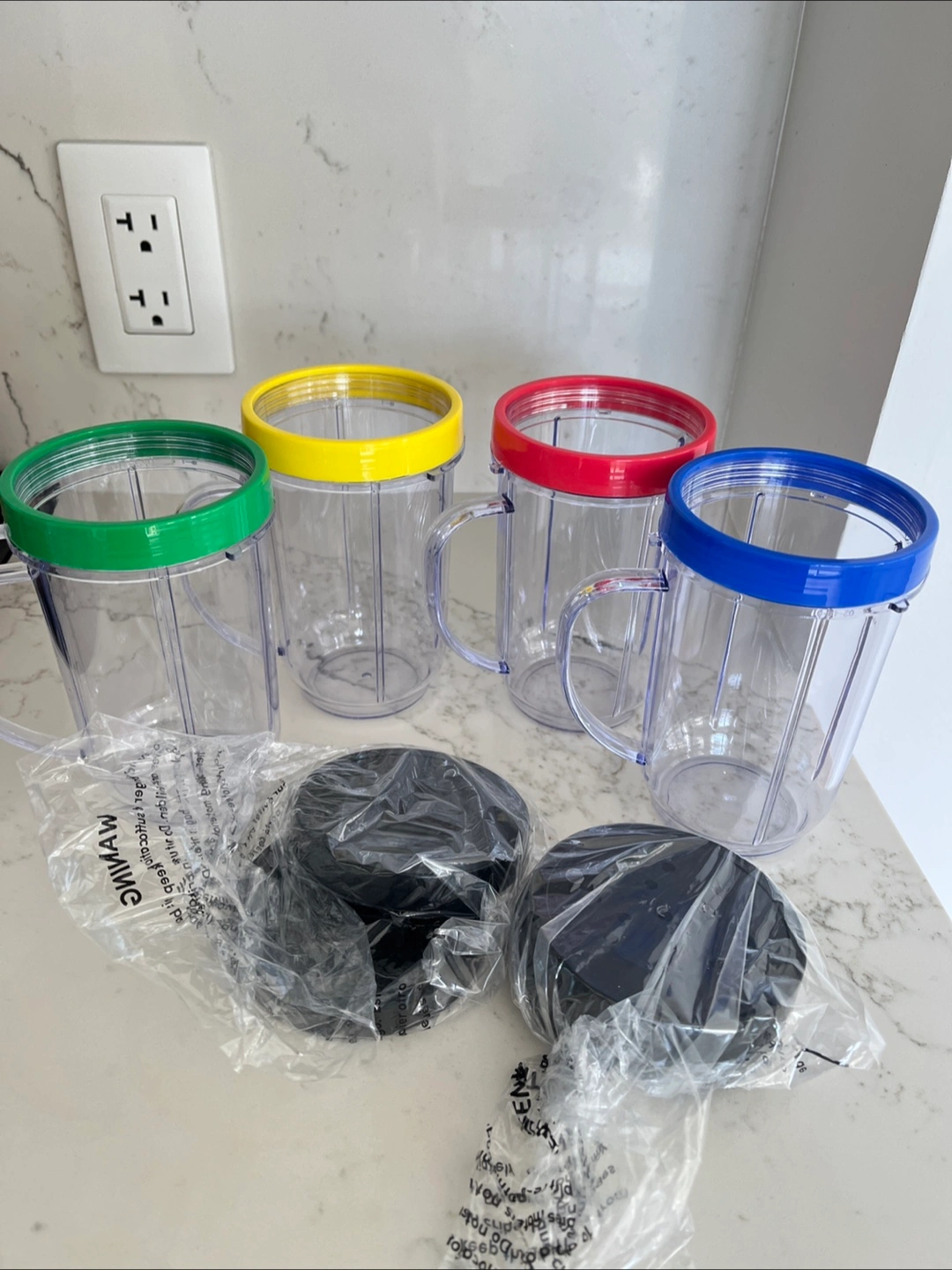 A set of clear cups with various coloured rims and handles. Never used. Includes black lids. These are perfect for smoothie preparation, chopping fruits and veggies.