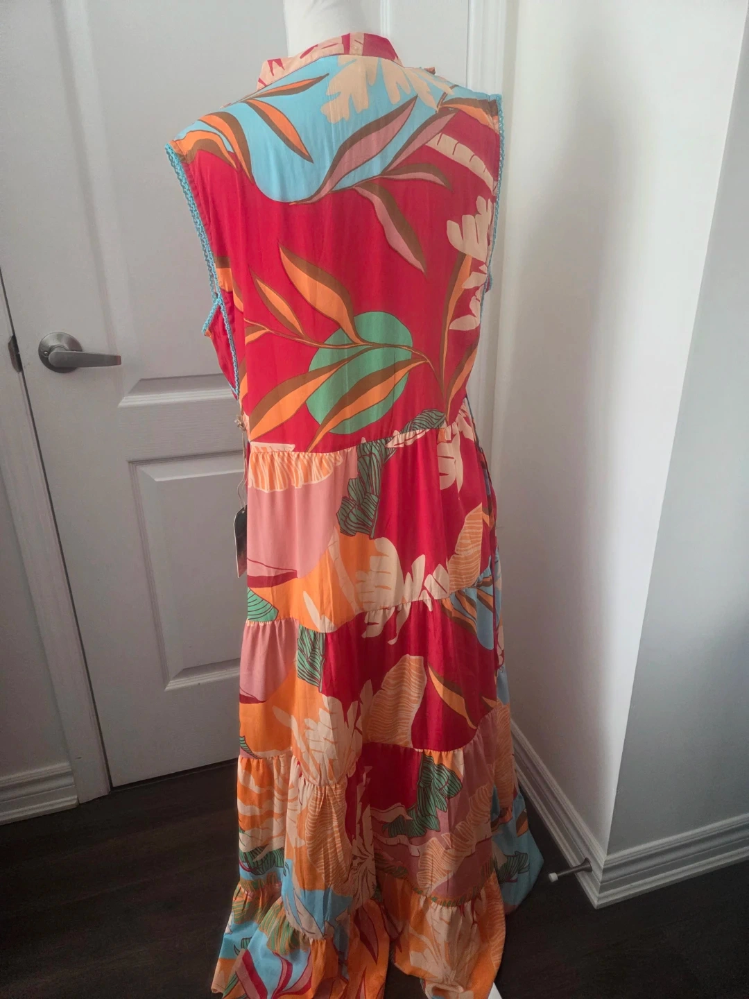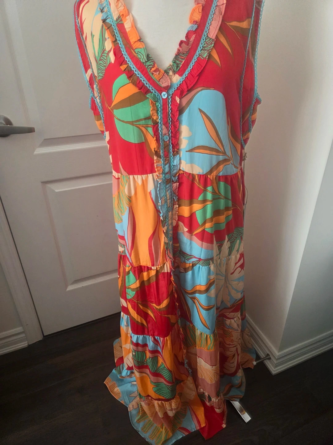 This vibrant maxi dress is from True Destinations Resort Wear. It features a colourful tropical print with a tiered skirt and blue braided trim. Perfect for a vacation or a warm summer day!