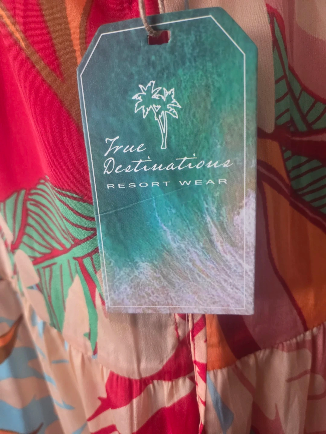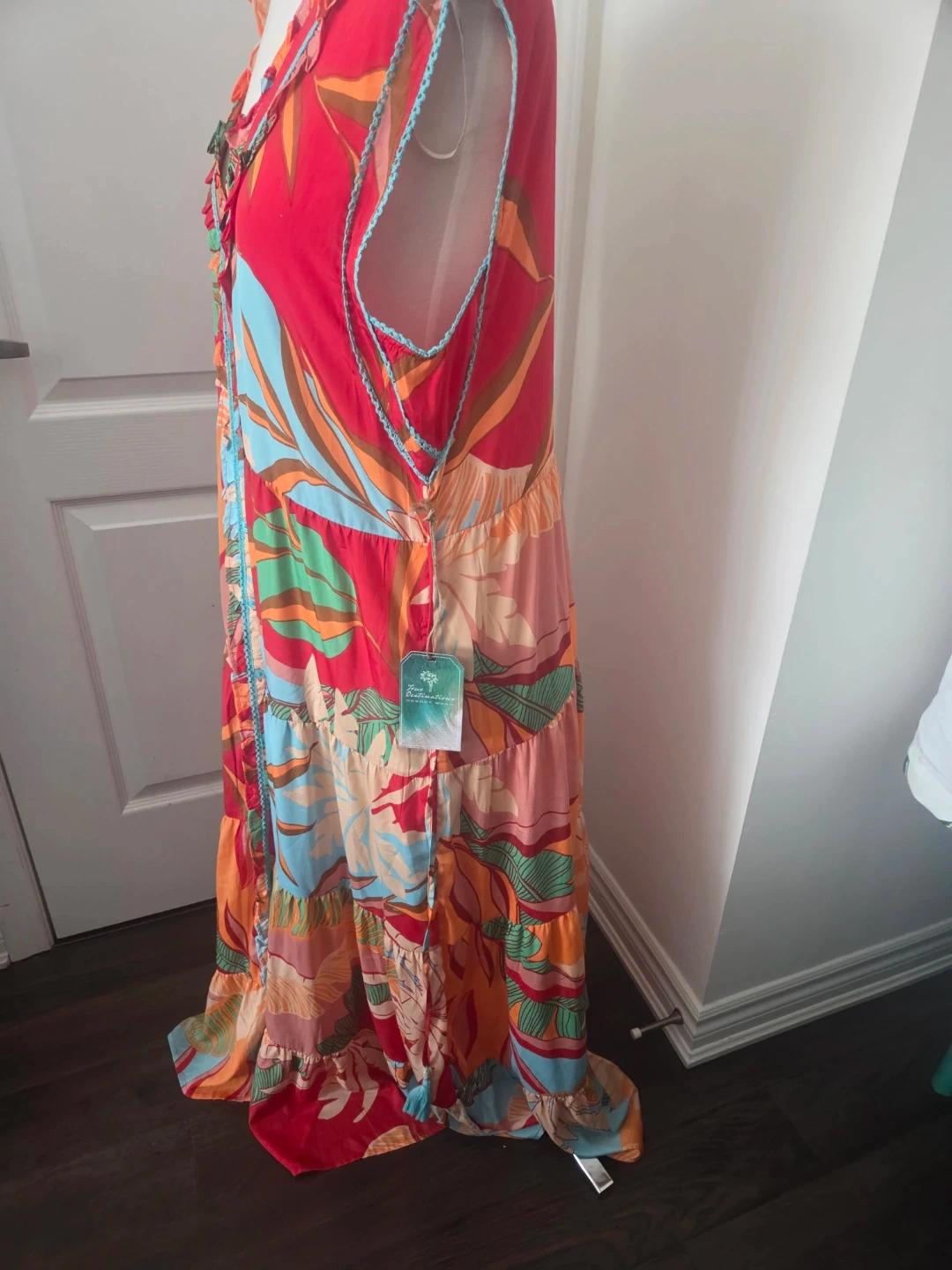 This vibrant maxi dress is from True Destinations Resort Wear. It features a colourful tropical print with a tiered skirt and blue braided trim. Perfect for a vacation or a warm summer day!