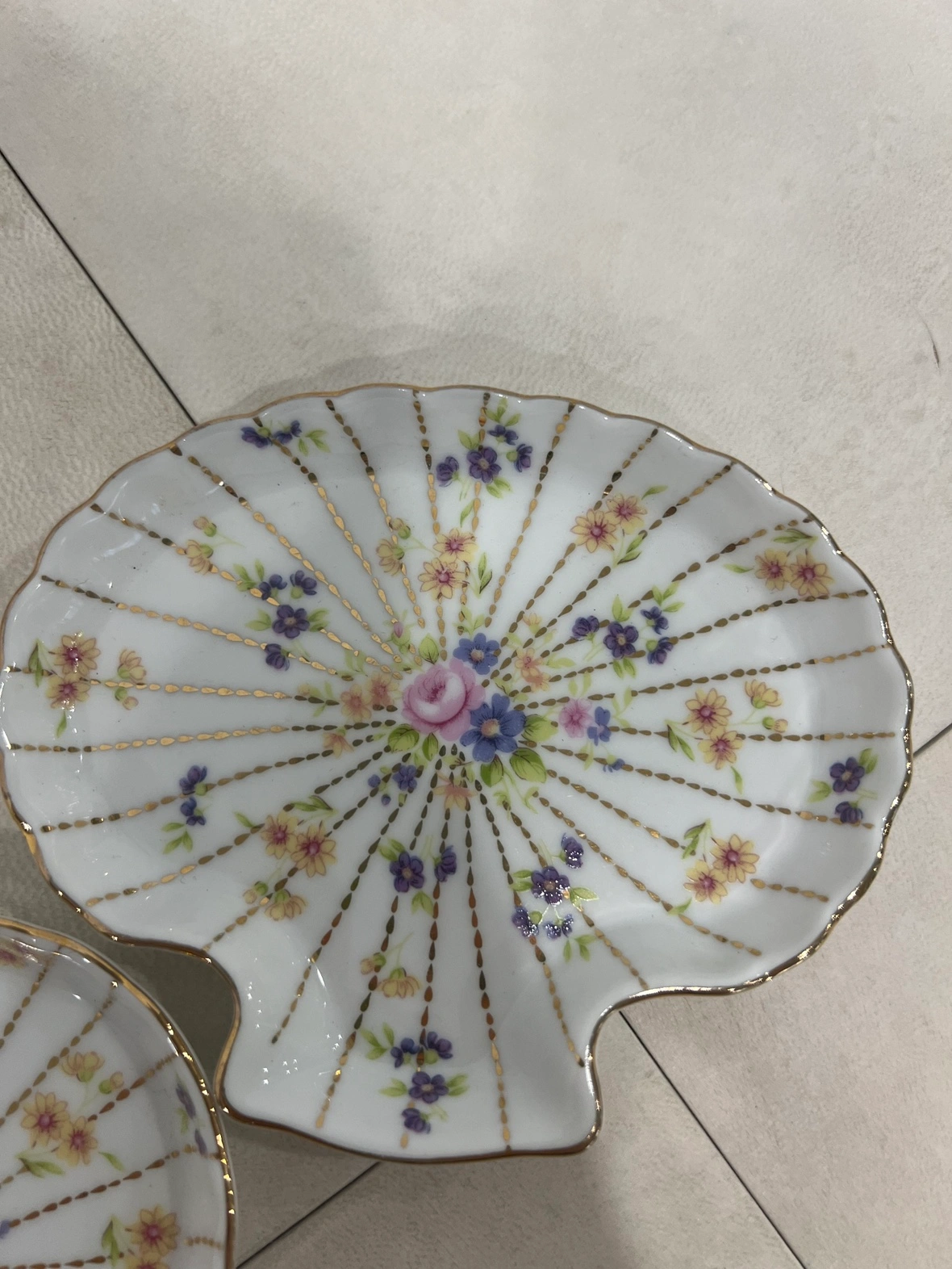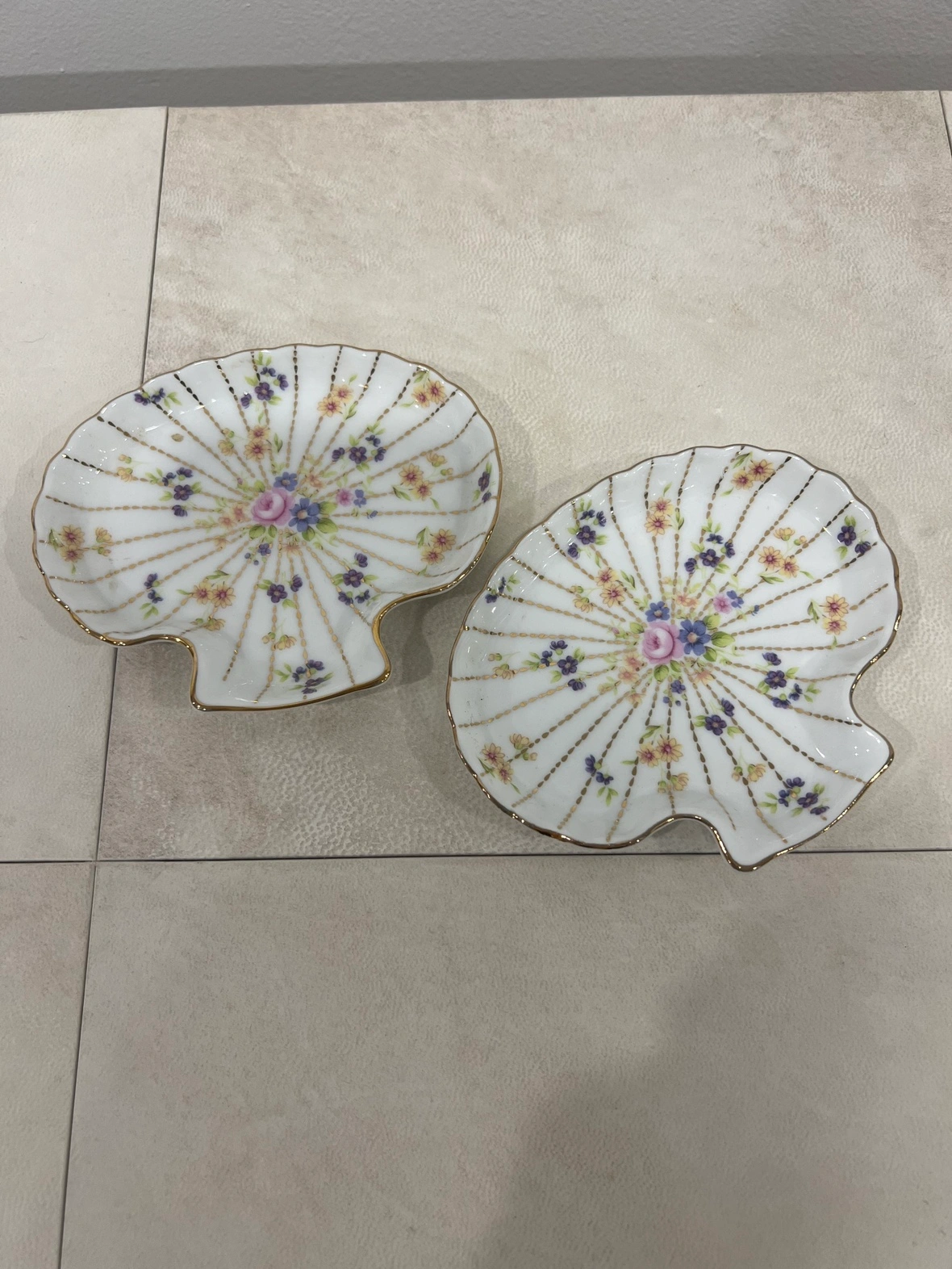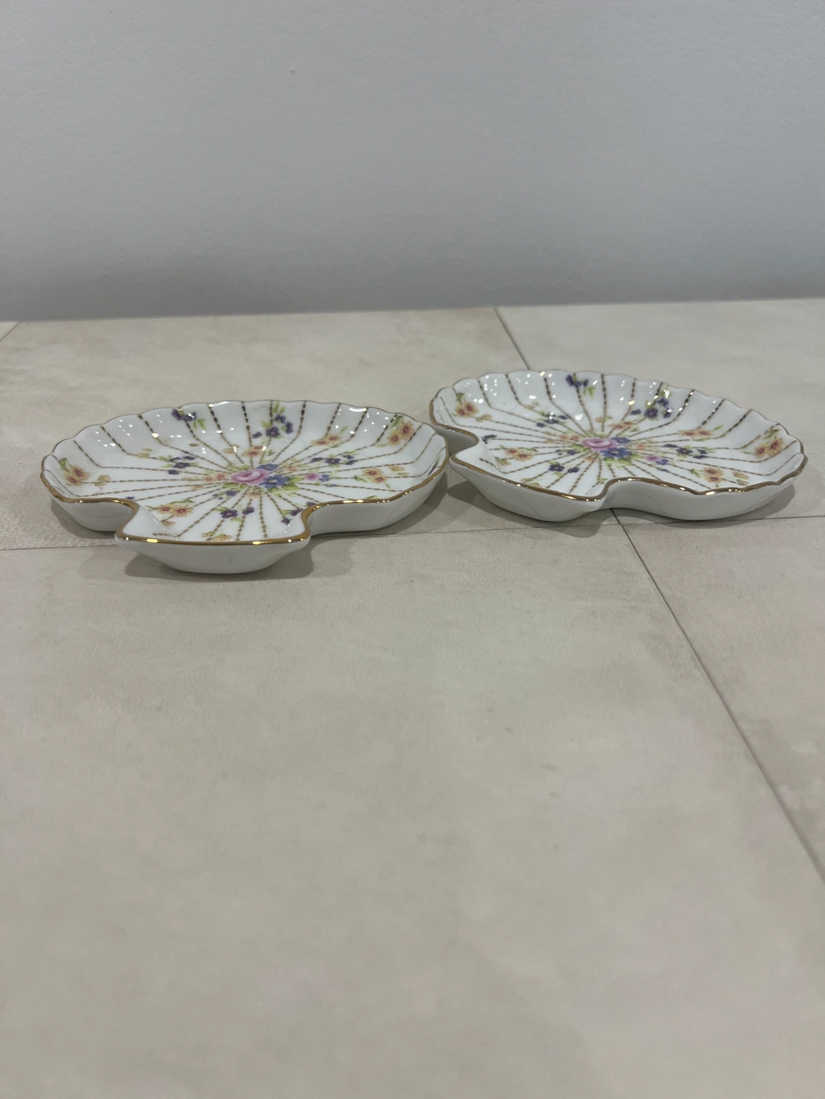 Set of 2 china dishes with beautiful flower details painted and gold trip. Perfect for displaying as a decorative piece or to keep jewellery or other small items in.