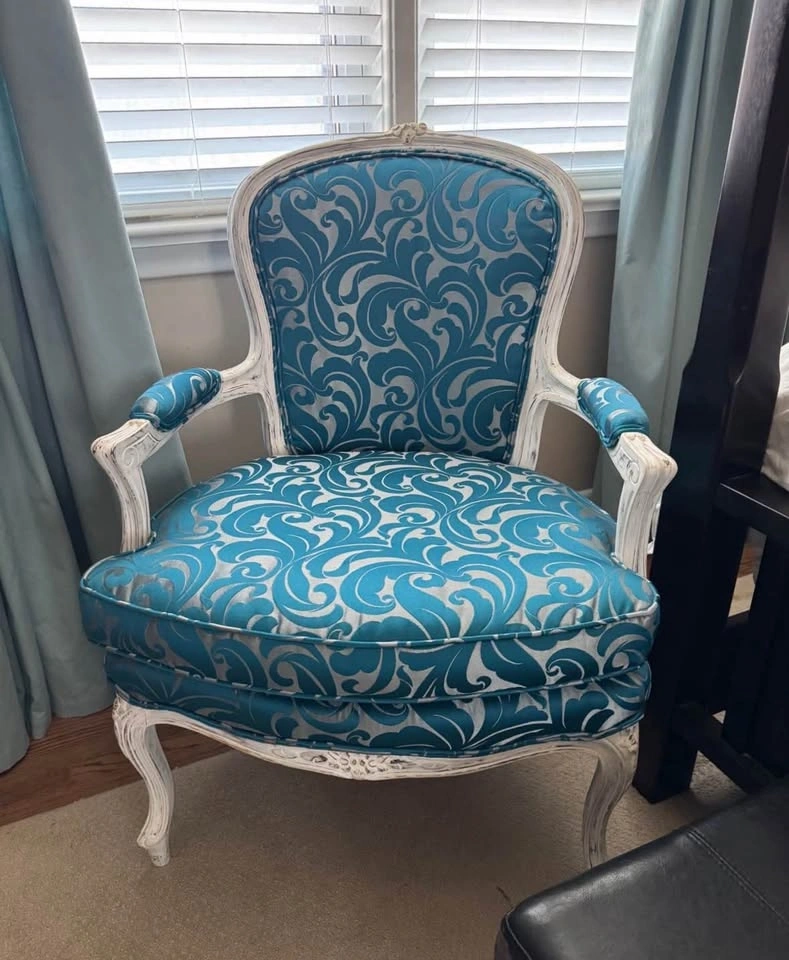 Beautiful newly upholstered armchairs with a distressed white wood frame and turquoise damask-style fabric. Solid, comfortable, and perfect as statement pieces for a living room, bedroom, sitting area, or office. Sturdy and comfortable. Sold individually or as a pair. Pick up only Victoria Village.