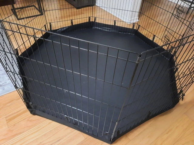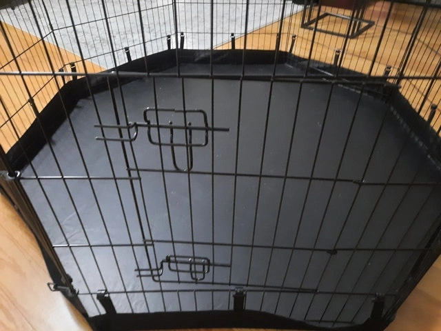 8 panels Foldable Metal Dog Exercise Pen with Bottom Pad, 24" H. Suitable for indoor or outdoor use for small to medium pets. Let me know if you're interested!