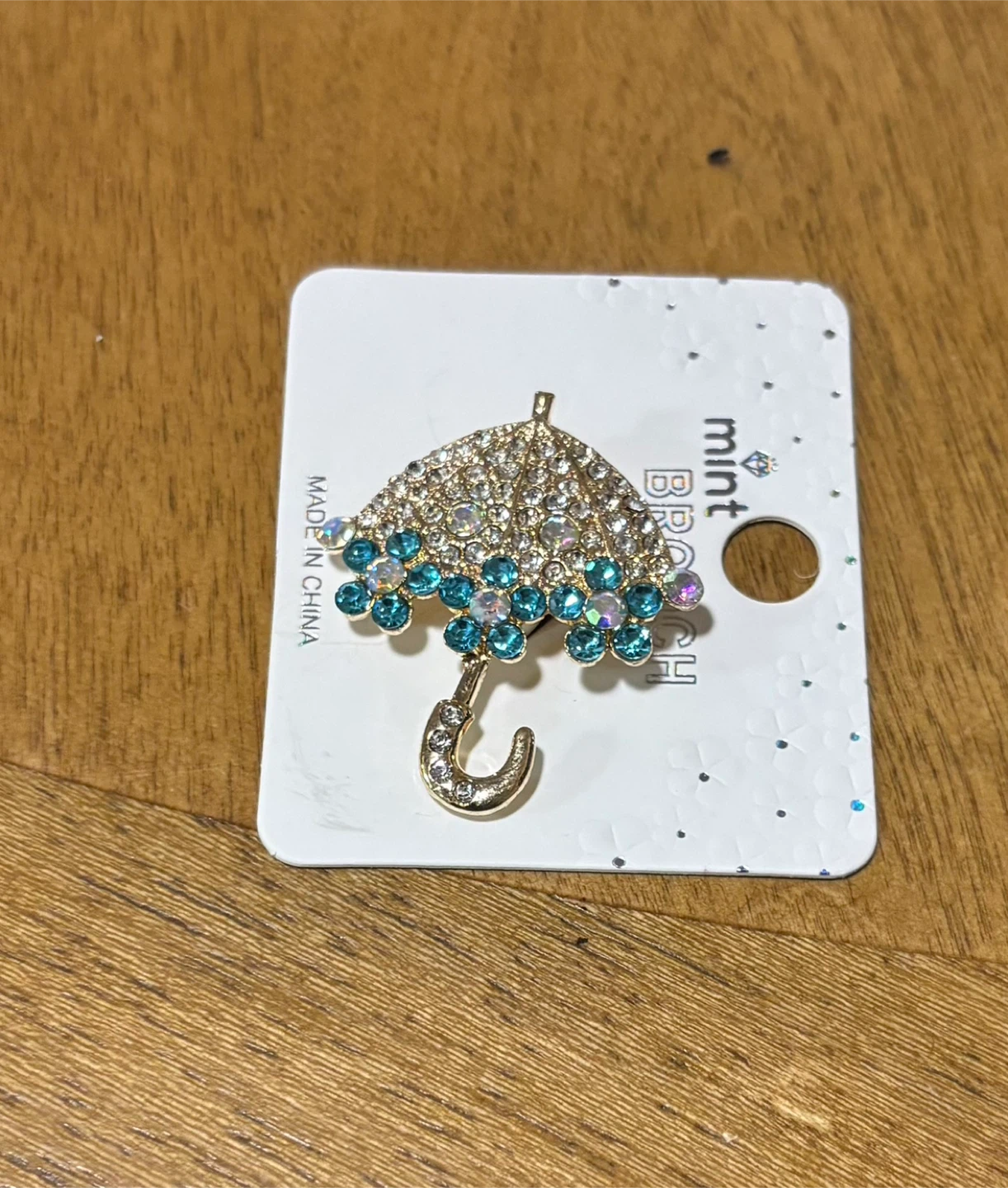 This is a sparkling umbrella brooch adorned with rhinestones and blue gems. It's attached to a white display card. It's a charming accessory for any outfit!