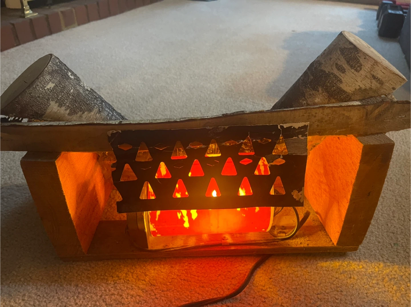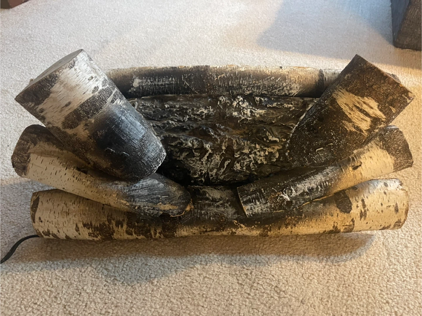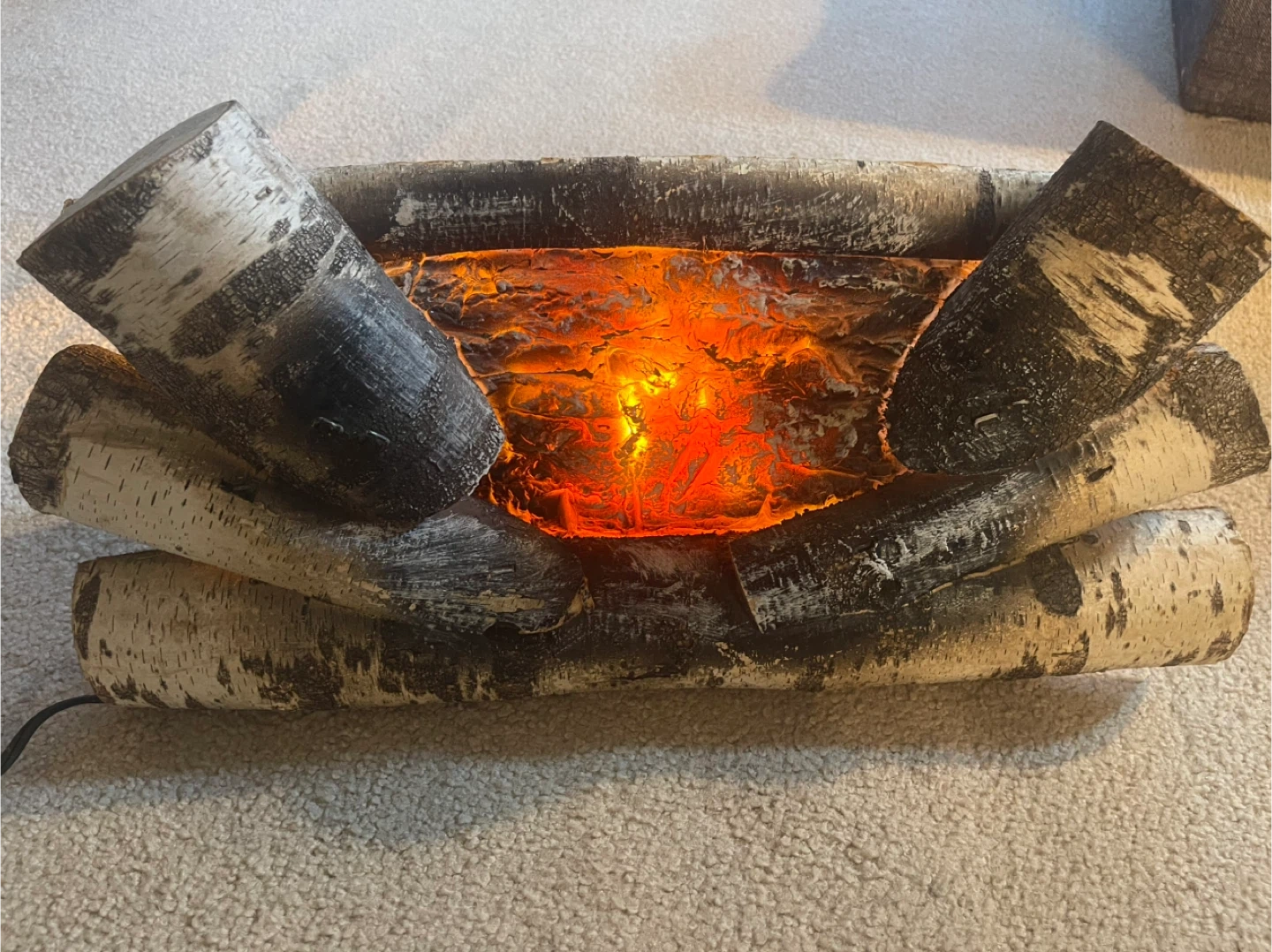 Birch logs with a lightbulb and a rotating gel insert which lights up the embers