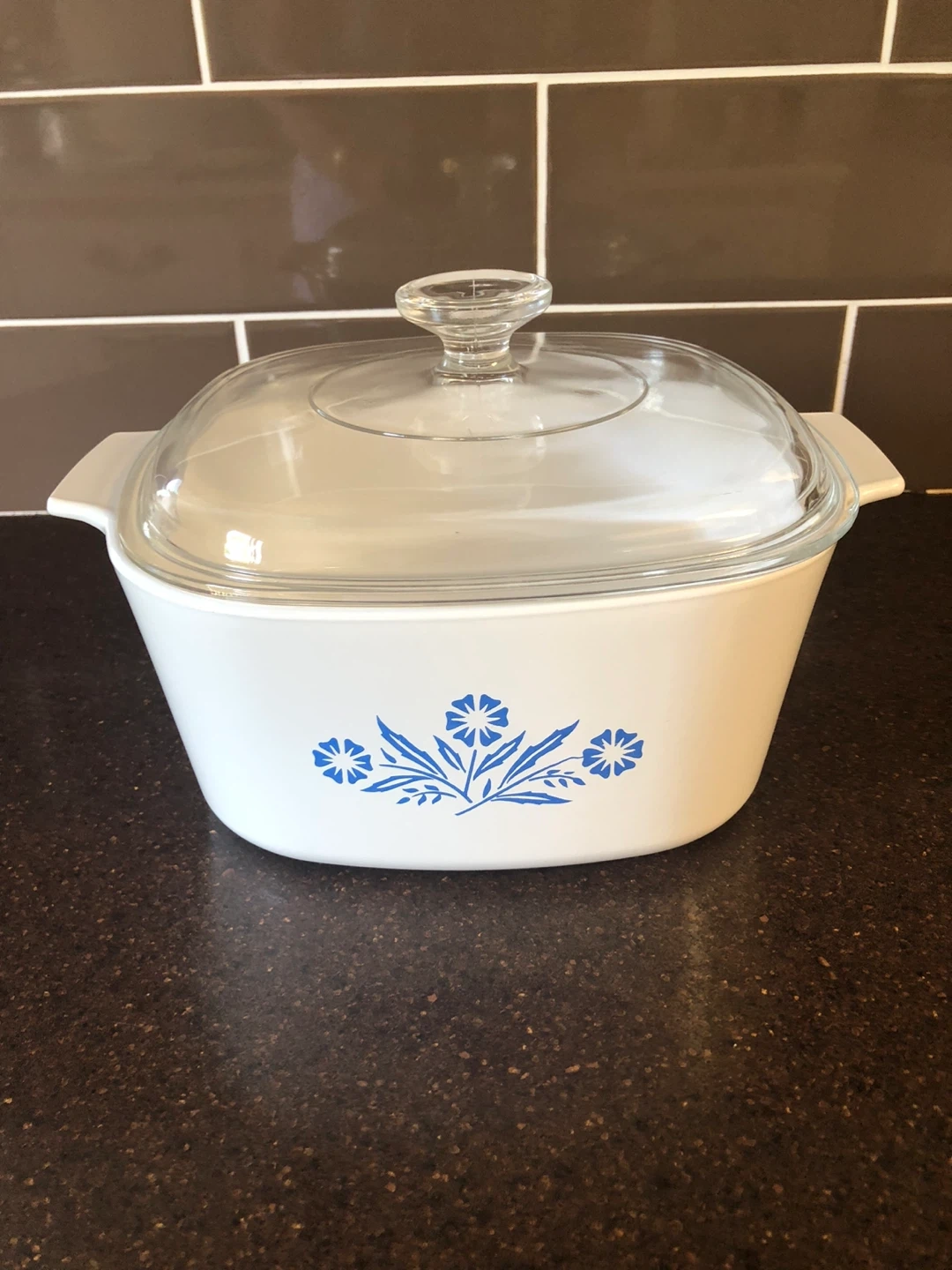 Selling a CorningWare casserole dish with a glass lid. It's in great shape and ready for your next culinary creation! The dish features a lovely blue floral pattern.