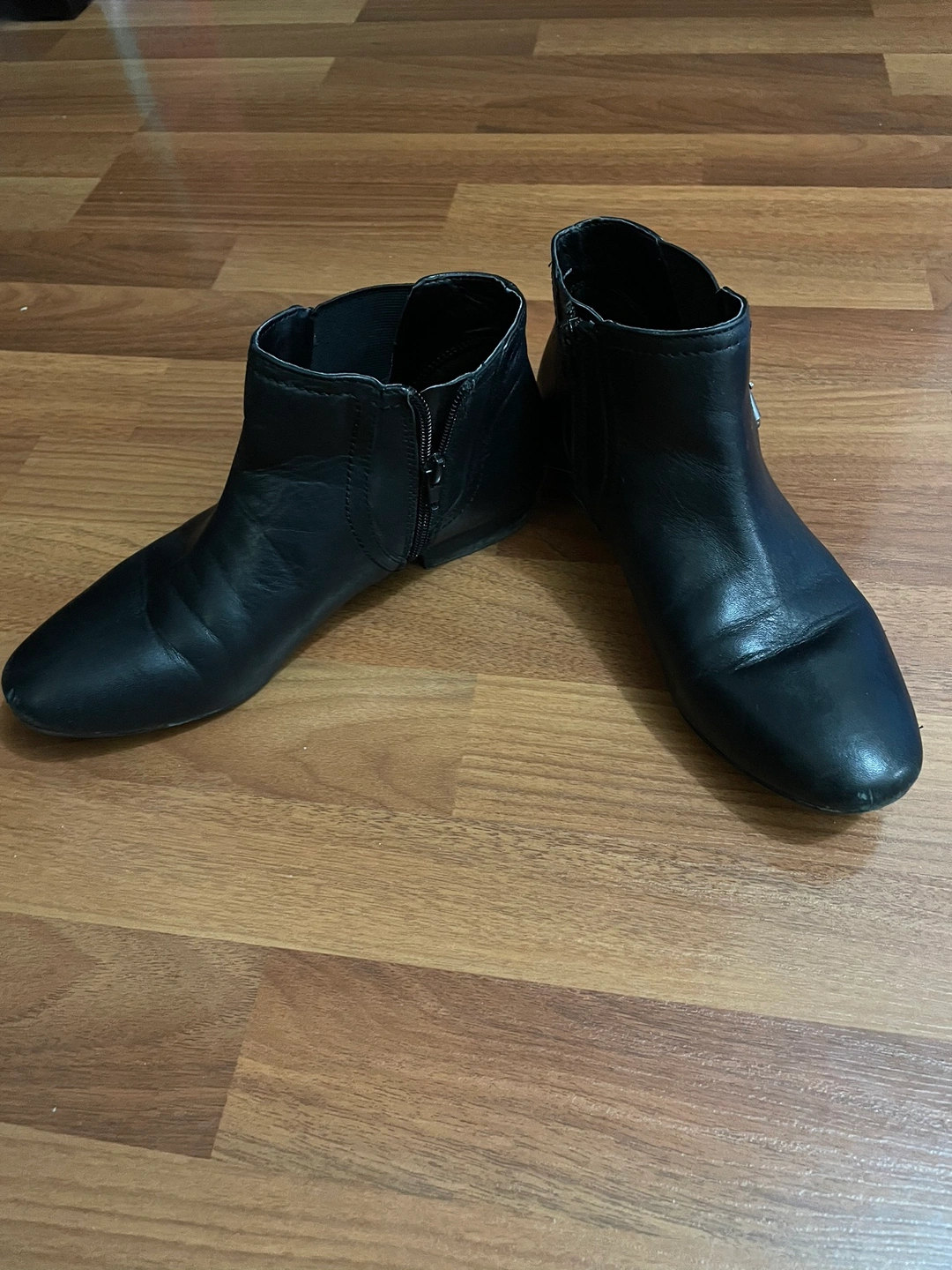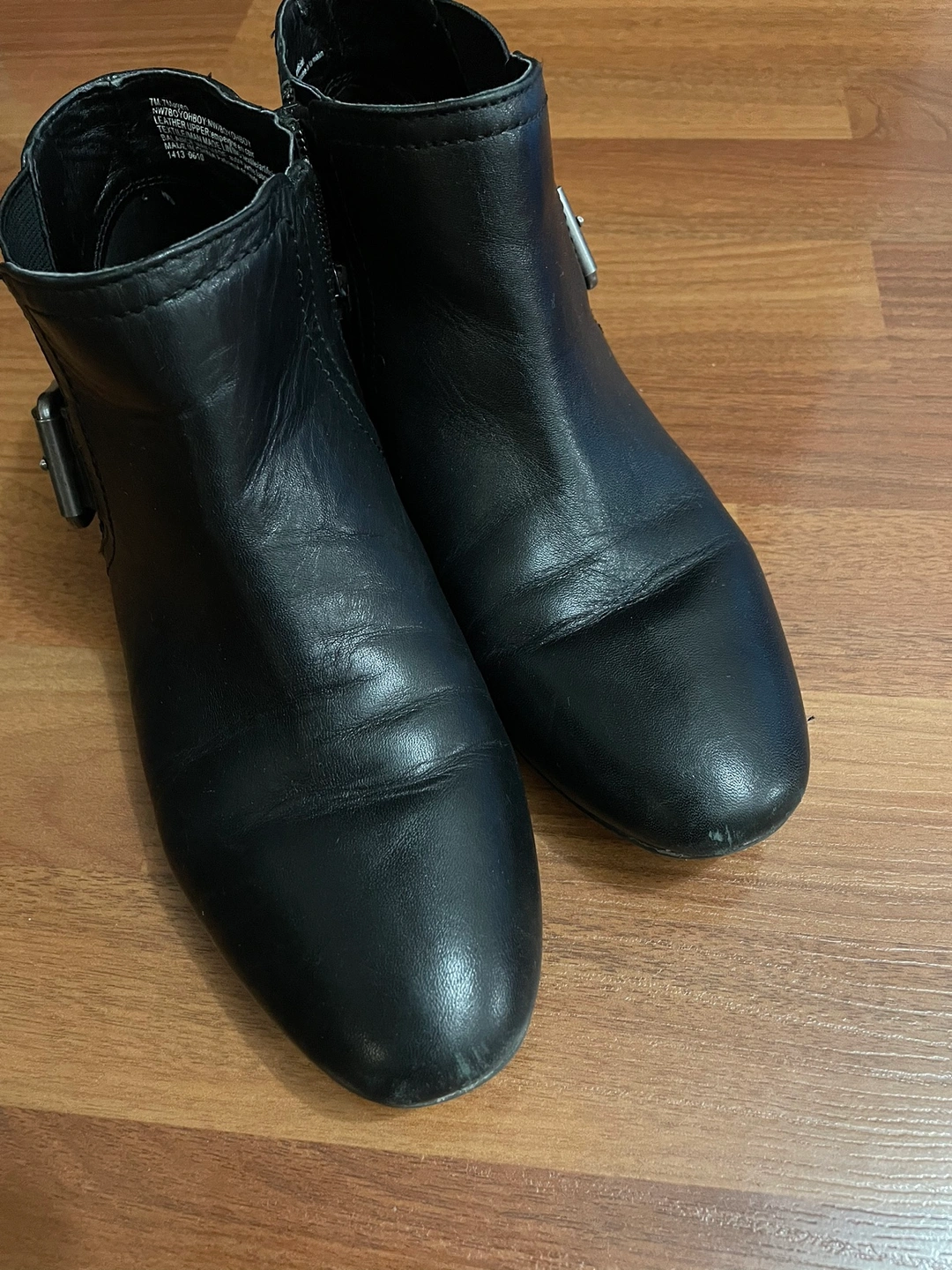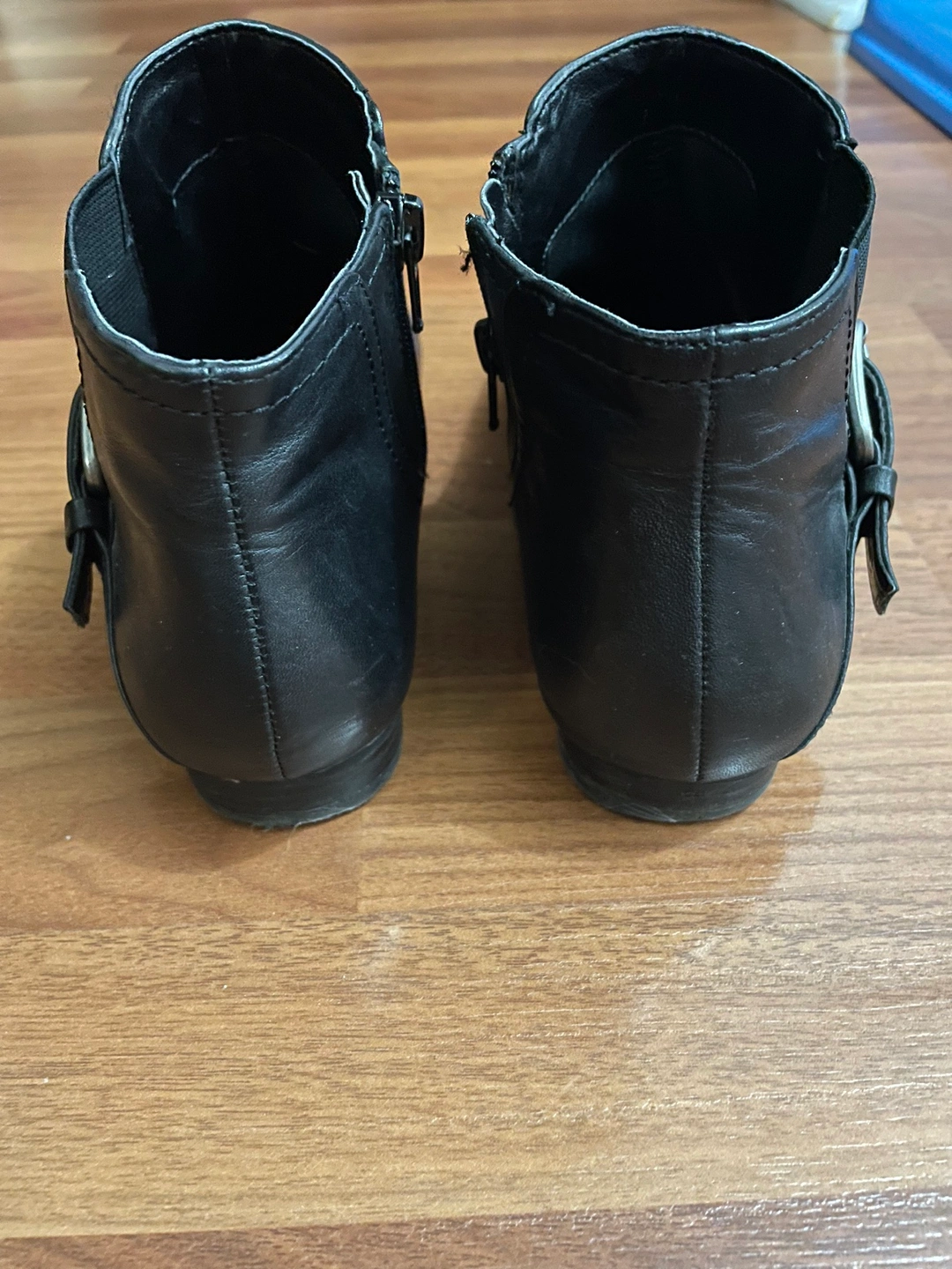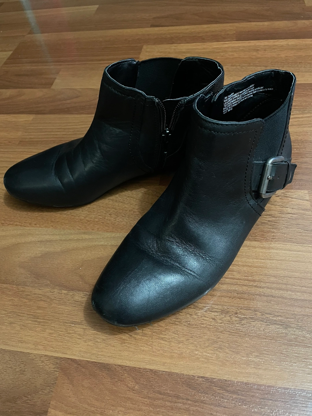 Black ankle boots with a buckle on the side and a zipper on the back. They are in good condition.