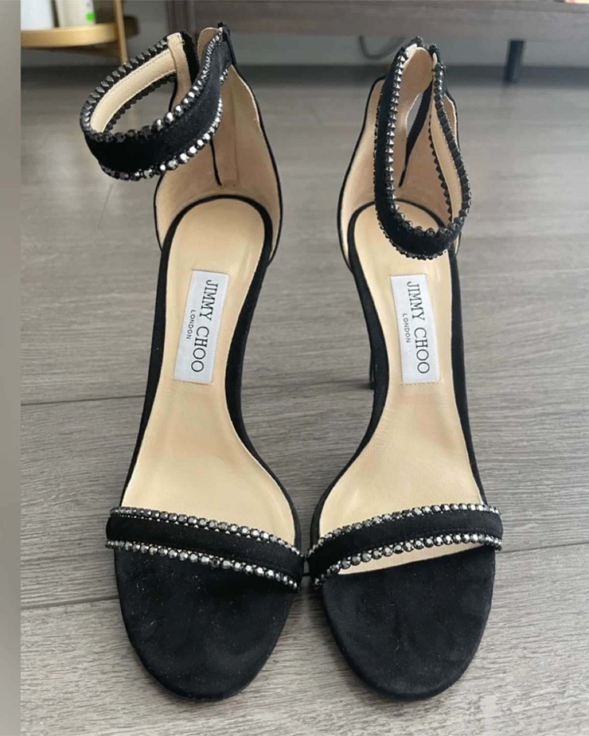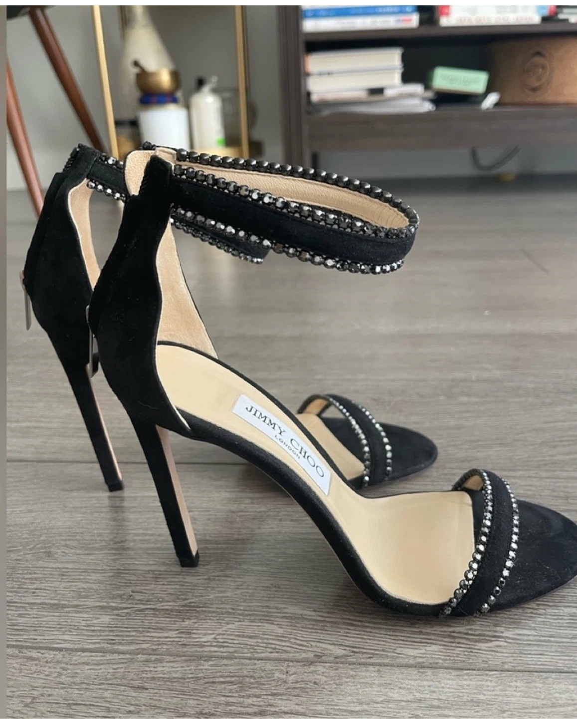 Jimmy Choo Dochas heels in black suede with crystal trim. Made in Italy. Size 39.