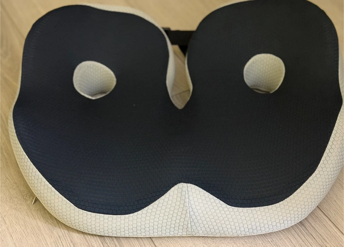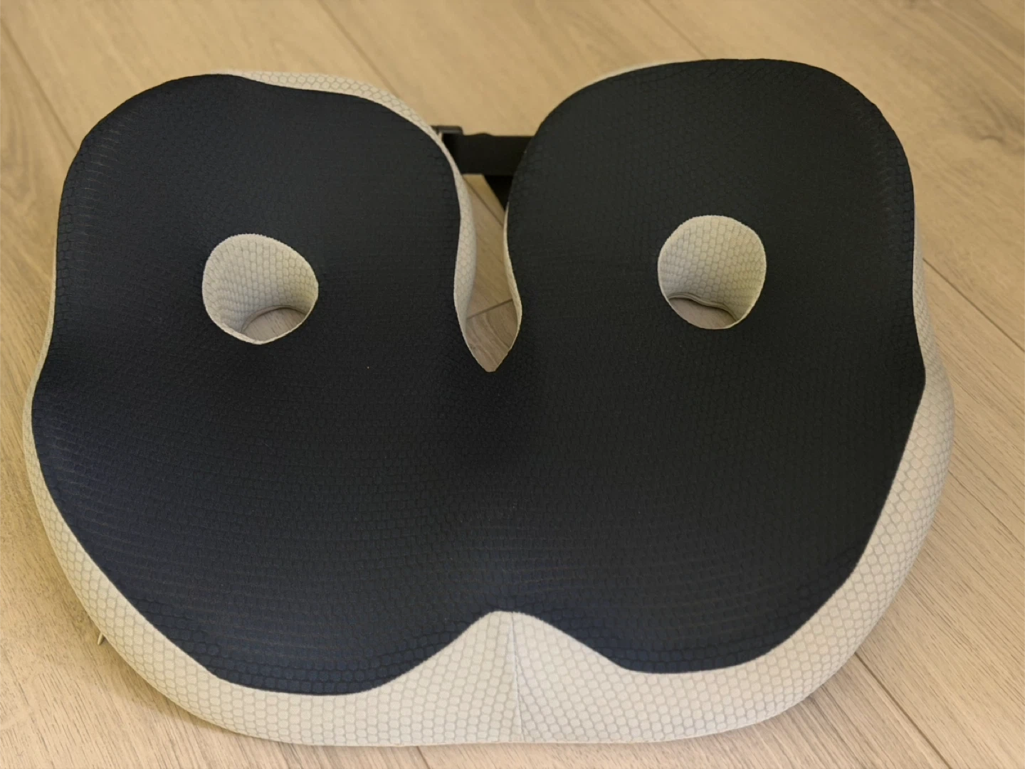 This is a dark blue and light grey ergonomic seat cushion. It's designed to provide comfortable seating. It features cutouts for pressure relief.