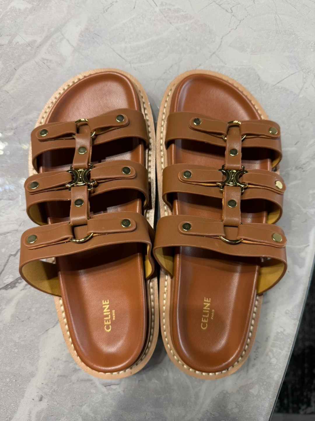 CELINE Brown Leather Triple Strap Sandals - Size 38