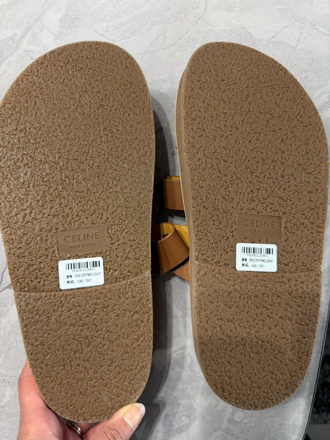 CELINE brown leather triple strap sandals. These sandals are a size 38 (240mm) and made in Italy. They feature a stylish design with gold-tone hardware.