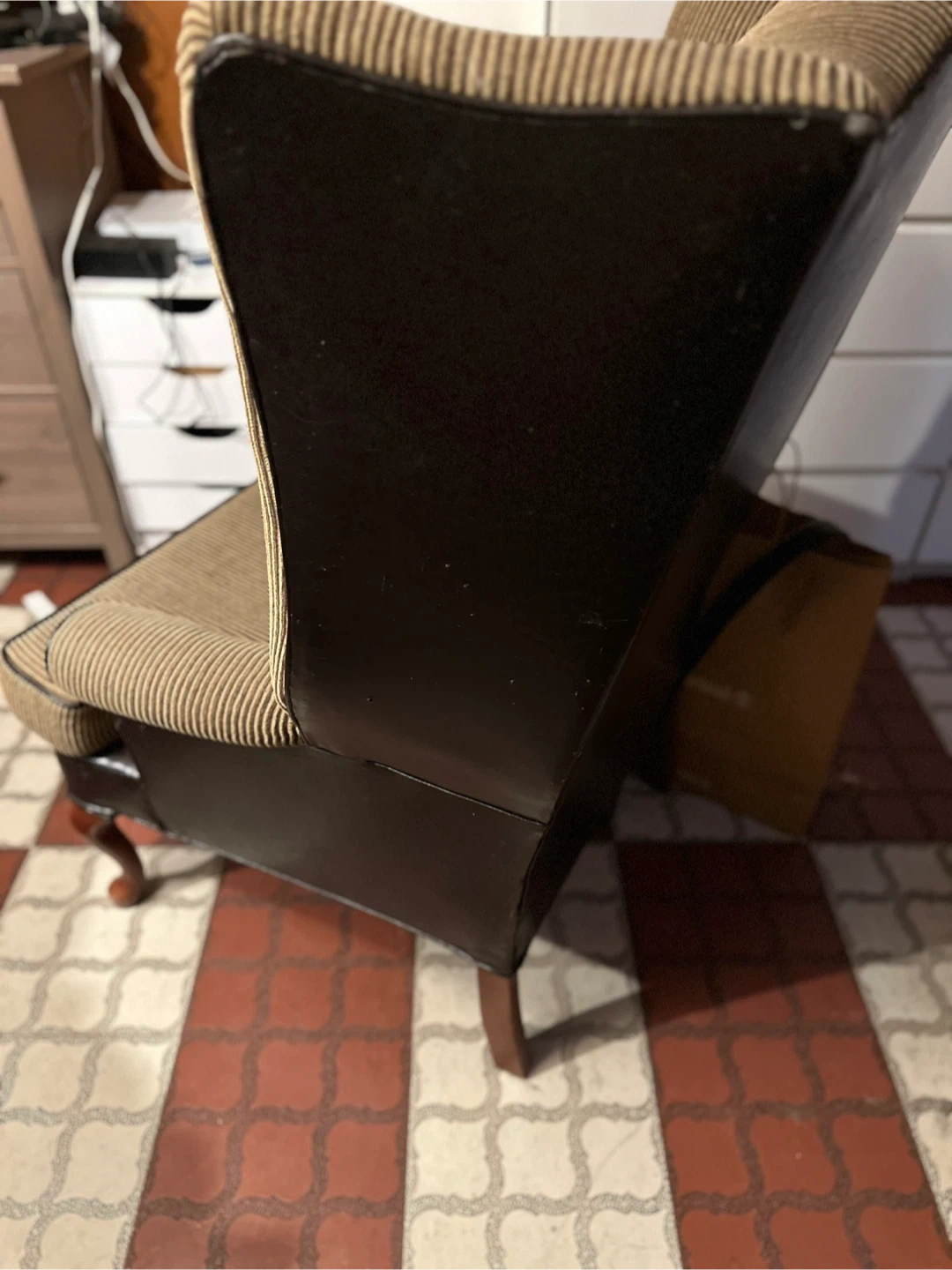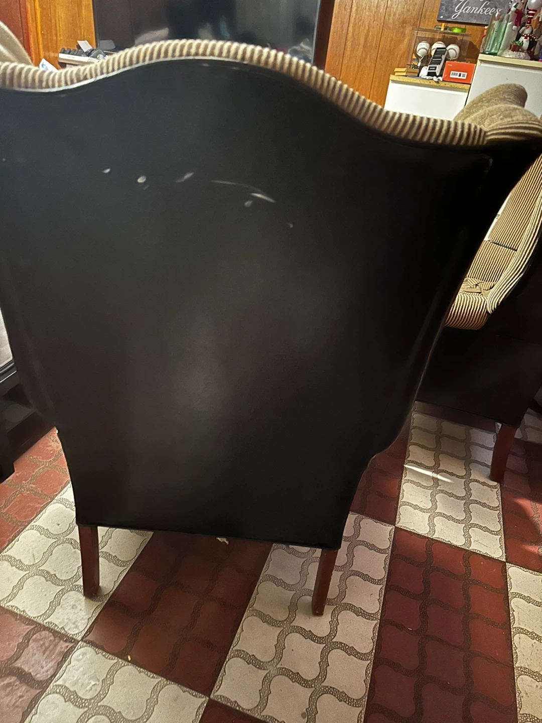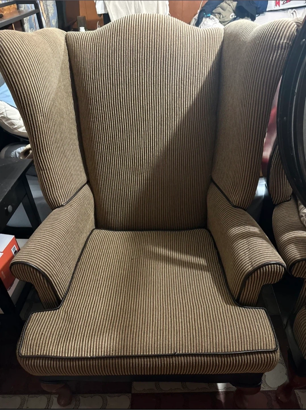 Two comfortable wingback armchairs with striped upholstery and dark wood legs. Each chair features a high back and padded arms. The upholstery is a brown and tan pinstripe fabric. The back of one chair has some scuff marks. Asking $150.00 obo