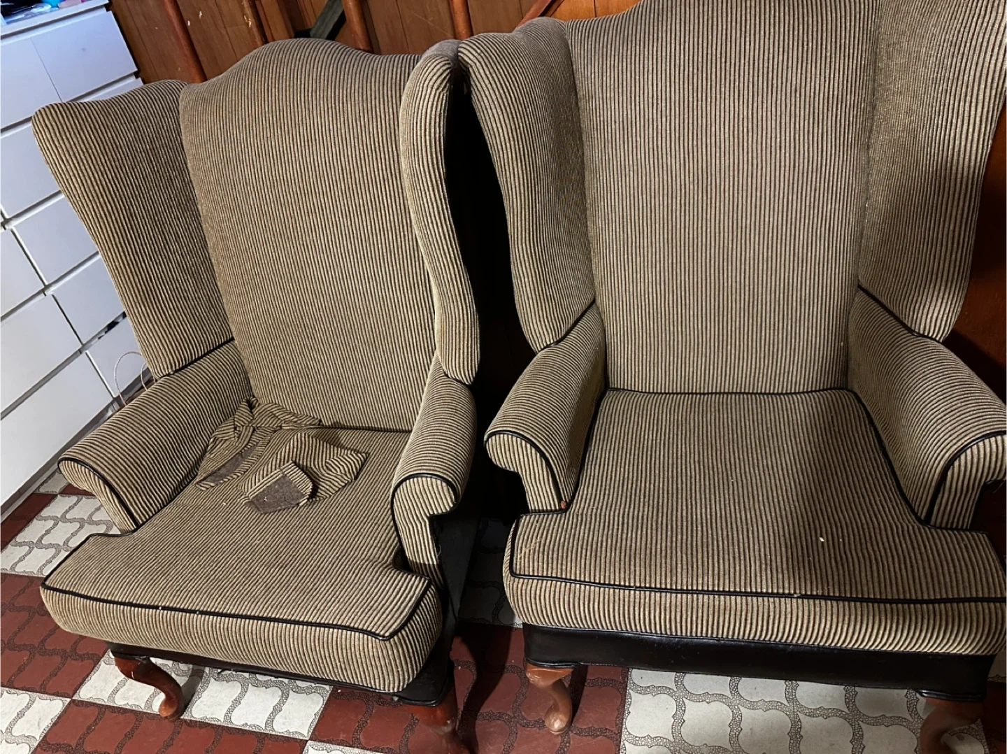 Two comfortable wingback armchairs with striped upholstery and dark wood legs. Each chair features a high back and padded arms. The upholstery is a brown and tan pinstripe fabric. The back of one chair has some scuff marks. Asking $150.00 obo