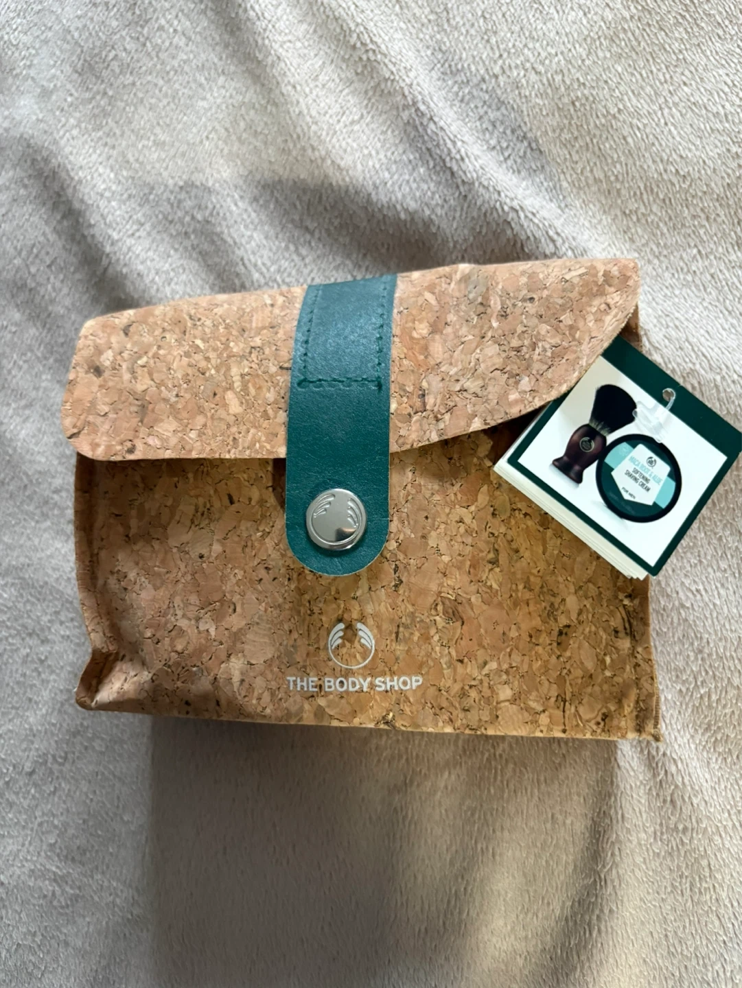 New -The Body Shop Maca Root & Aloe Softening Shaving Cream for Men. The cream comes in a 200ml container. A wooden shaving brush with FSC. The items are presented in a cork-style pouch from The Body Shop.