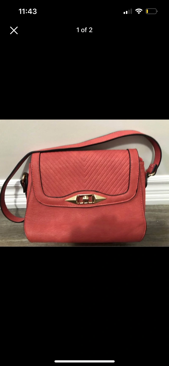 Stylish coral-coloured crossbody bag. Features a quilted chevron pattern and gold-toned hardware. Adjustable strap. Great for everyday use.