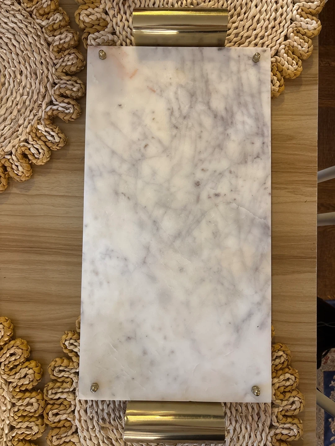 White marble serving tray with two gold-toned handles. This tray is made from marble and metal. It's great for serving appetizers or as a decorative piece.