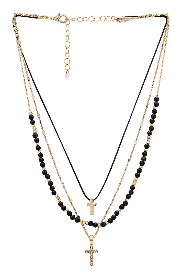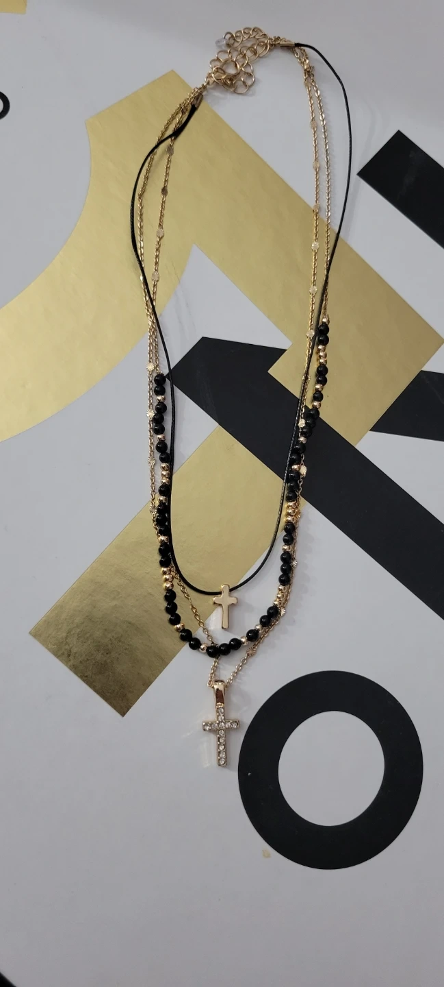 Stylish layered necklace with gold chains and black beads. Features cross pendants for a trendy look.
