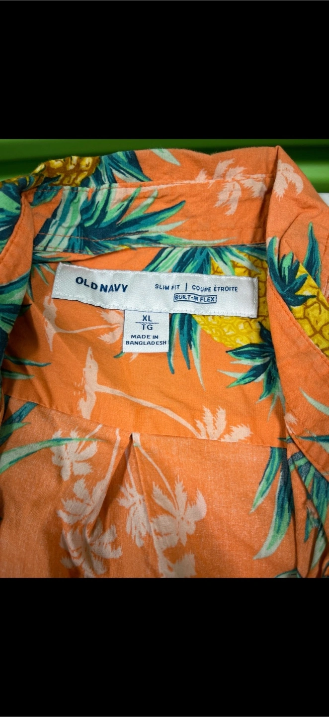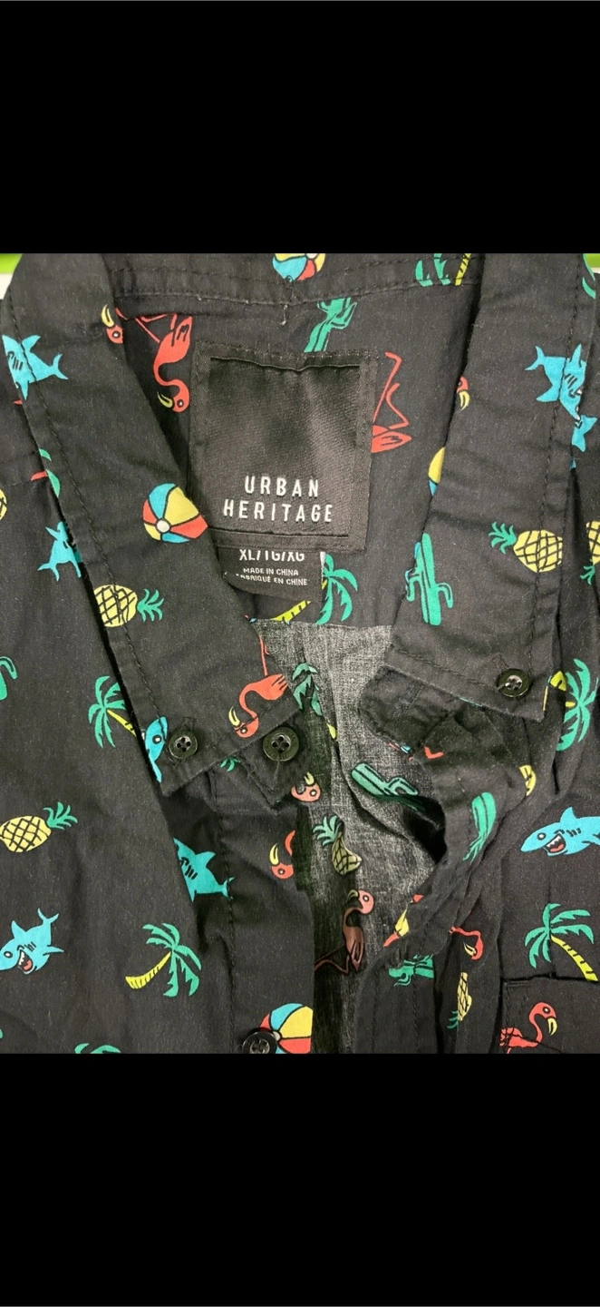 Two button-up shirts in size XL! One is from Old Navy with a fun pineapple print, and the other is from Urban Heritage with a beachy/tropical theme.