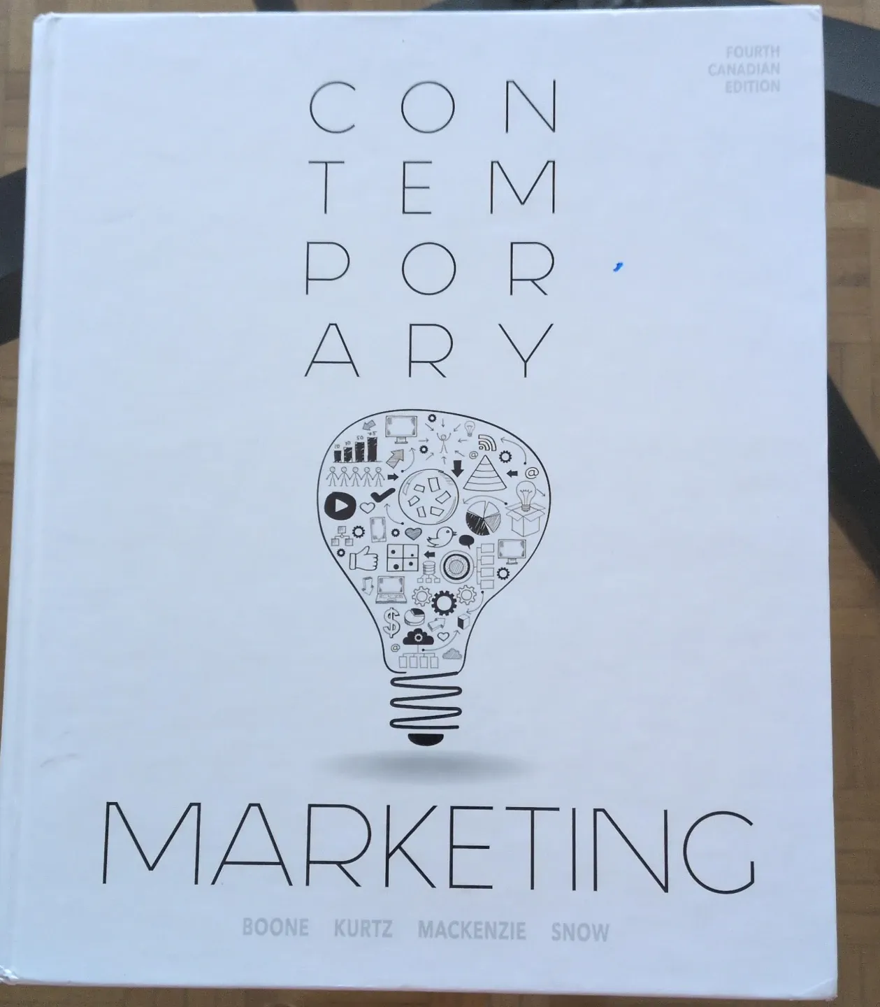This is the Fourth Canadian Edition of Contemporary Marketing. It covers marketing principles and strategies. The book features authors Boone, Kurtz, Mackenzie, and Snow.
