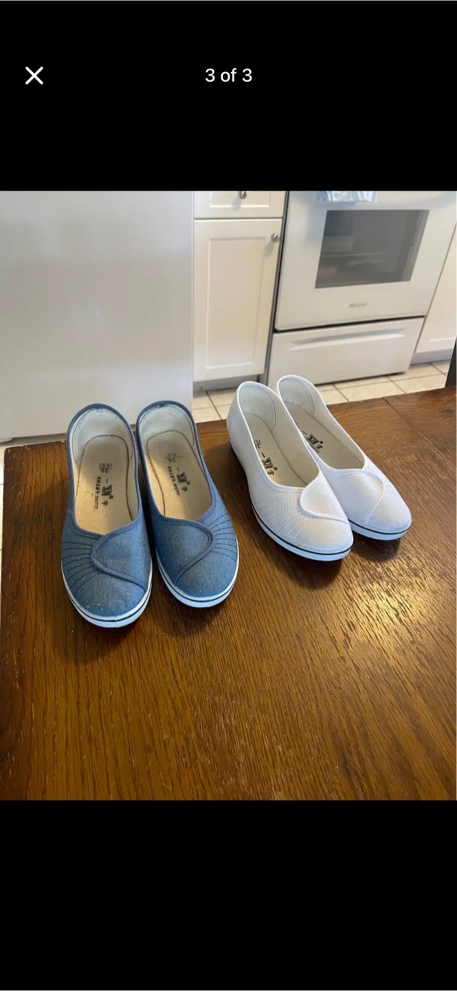 Two pairs of women's comfortable flat shoes. One pair is a blue denim material with white stitching detail, and the other pair is white with a textured finish. Both are slip-on style. Great for everyday wear!