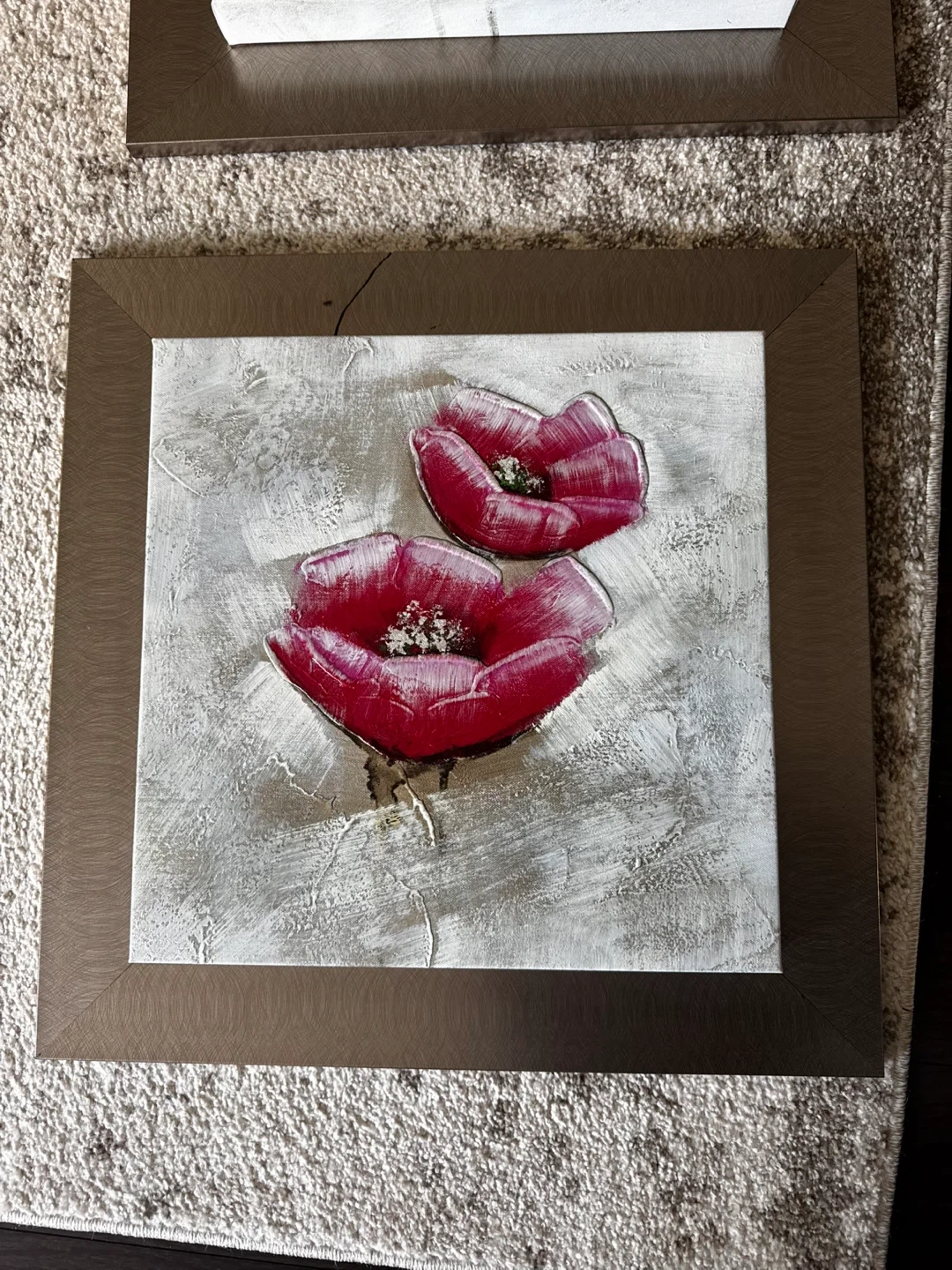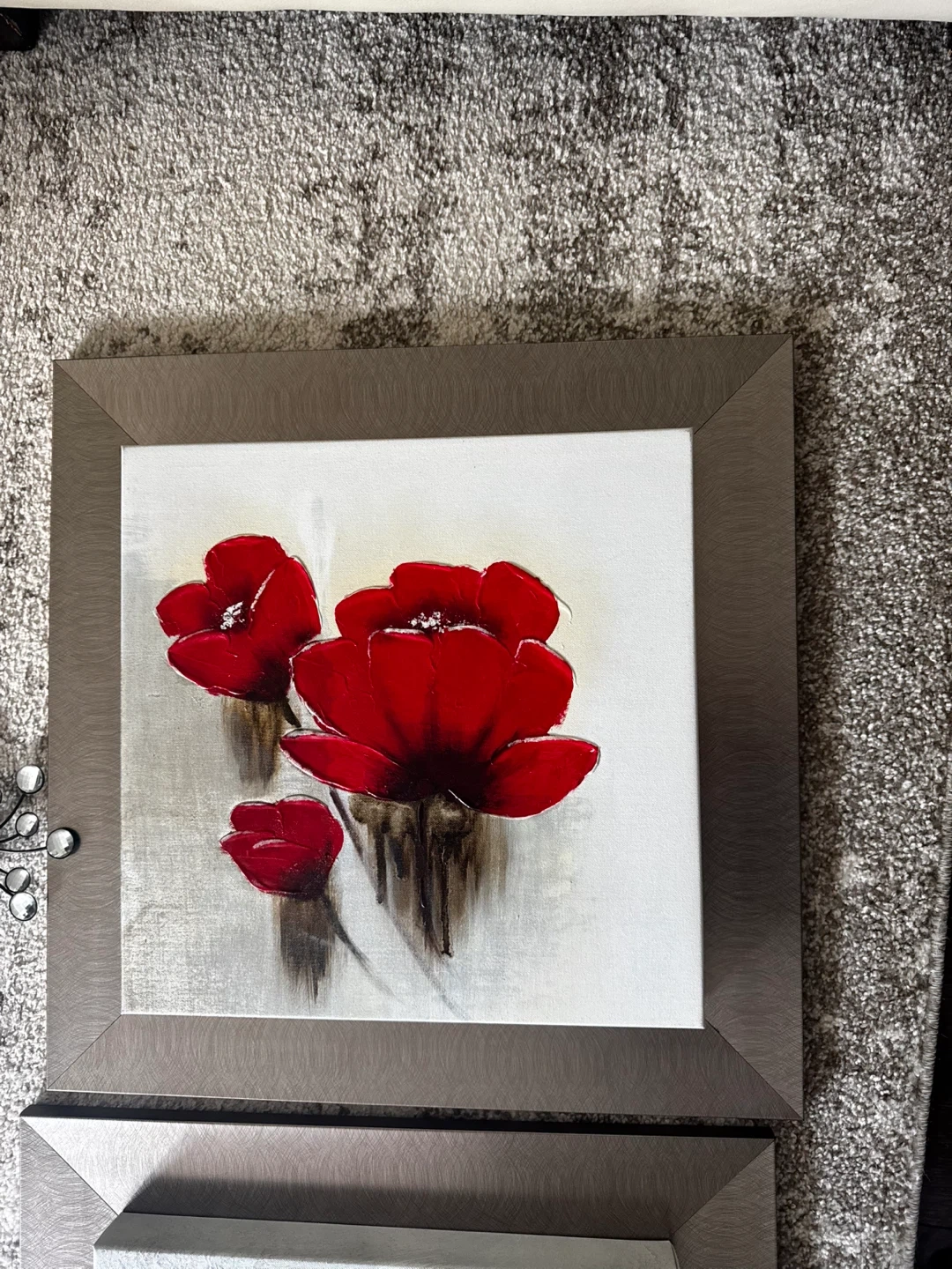 Selling a set of 3 framed floral paintings. They feature vibrant red flowers on a textured grey and white background. The frames are a neutral metallic colour. They would look great as a set or individually!