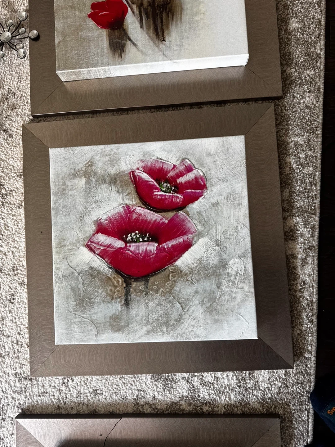Selling a set of 3 framed floral paintings. They feature vibrant red flowers on a textured grey and white background. The frames are a neutral metallic colour. They would look great as a set or individually!