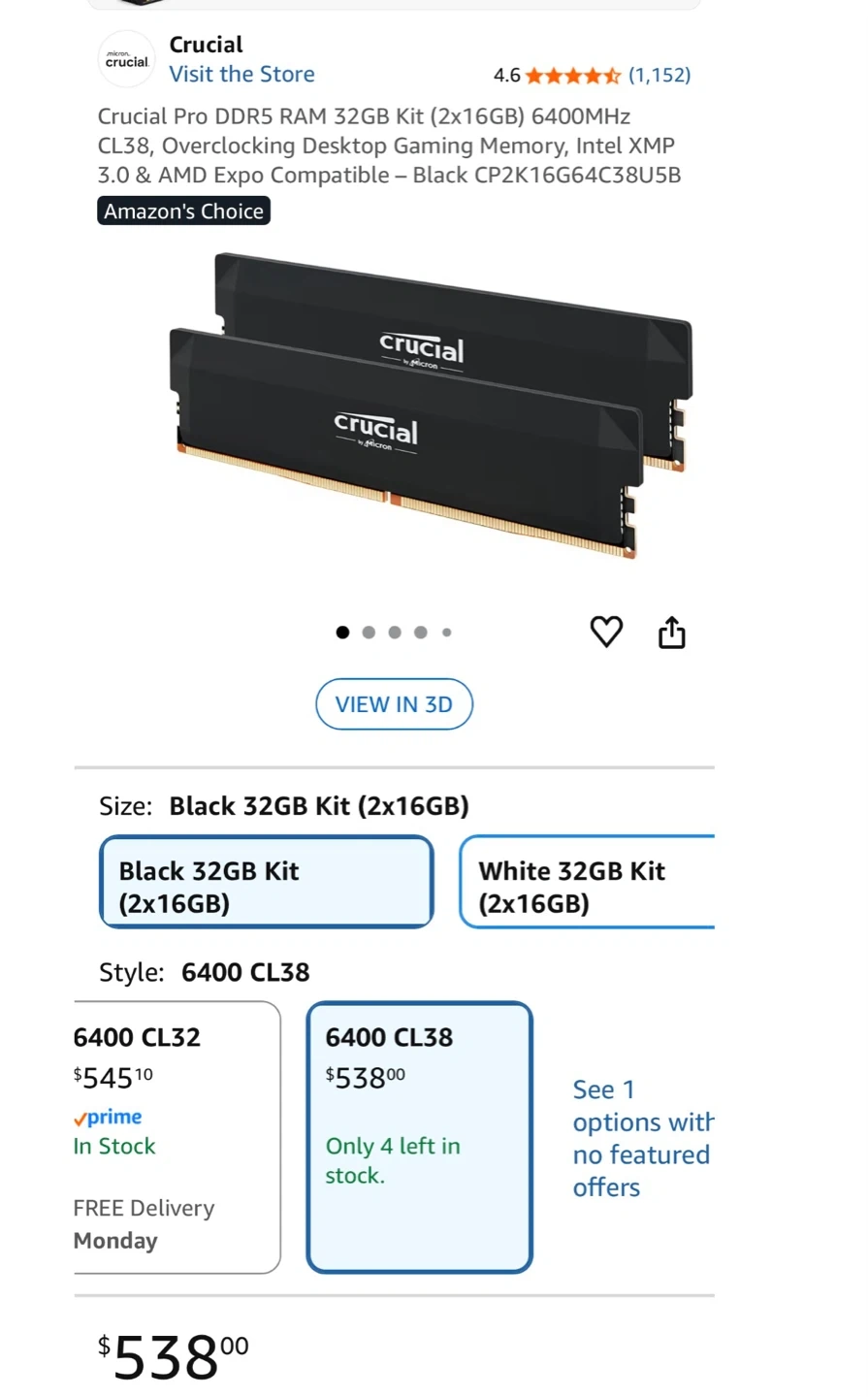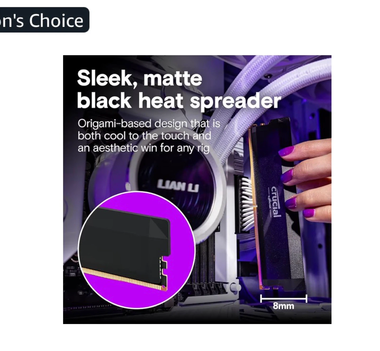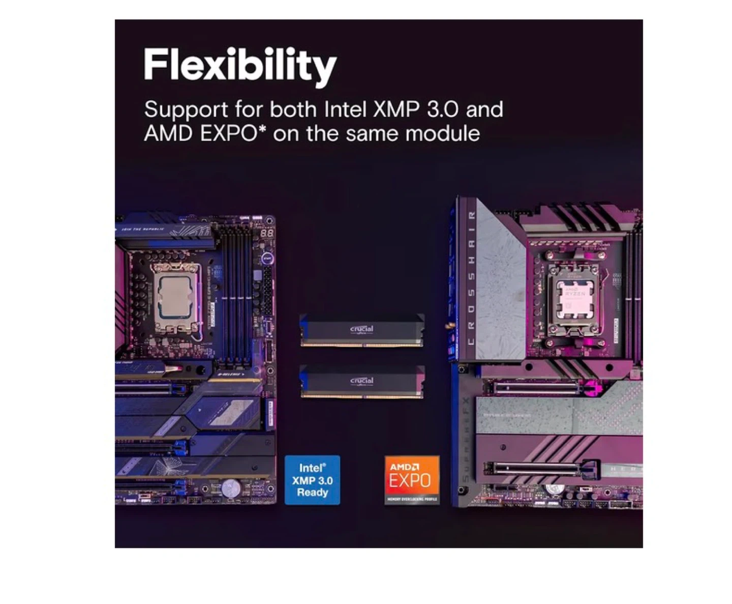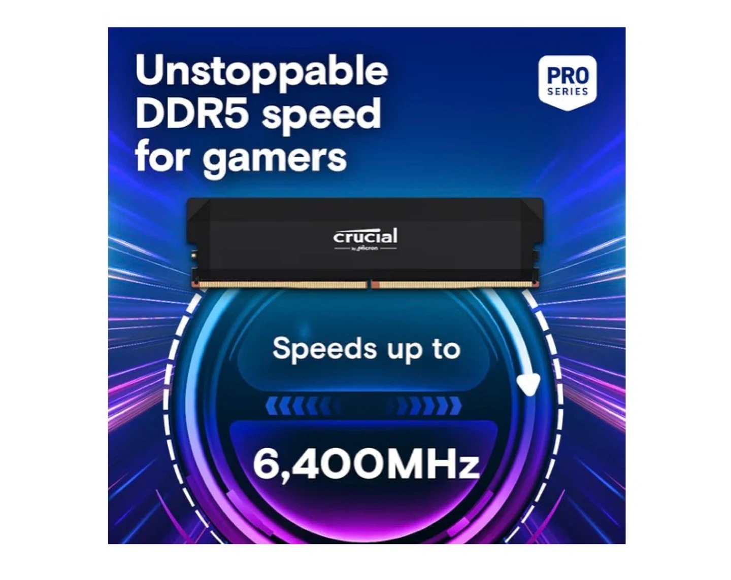 Unstoppable DDR5 speed for gamers! This Crucial Pro RAM kit comes as a 32GB (2x16GB) set with speeds up to 6400MHz and CL38 latency. It supports both Intel XMP 3.0 and AMD EXPO profiles. Sleek, matte black heat spreader design.