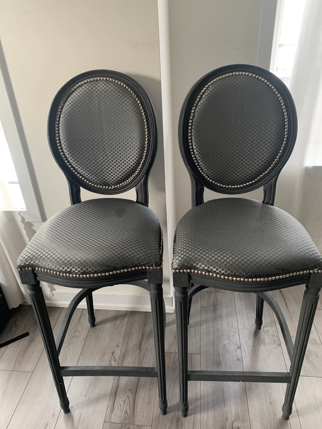 Selling a set of two stylish bar stools. They feature a classic oval backrest and comfortable seat upholstered in a textured dark grey fabric, accented with silver nailhead trim. The wooden frames are painted black with elegant carved details. These stools would look great in a kitchen island or home bar setting!