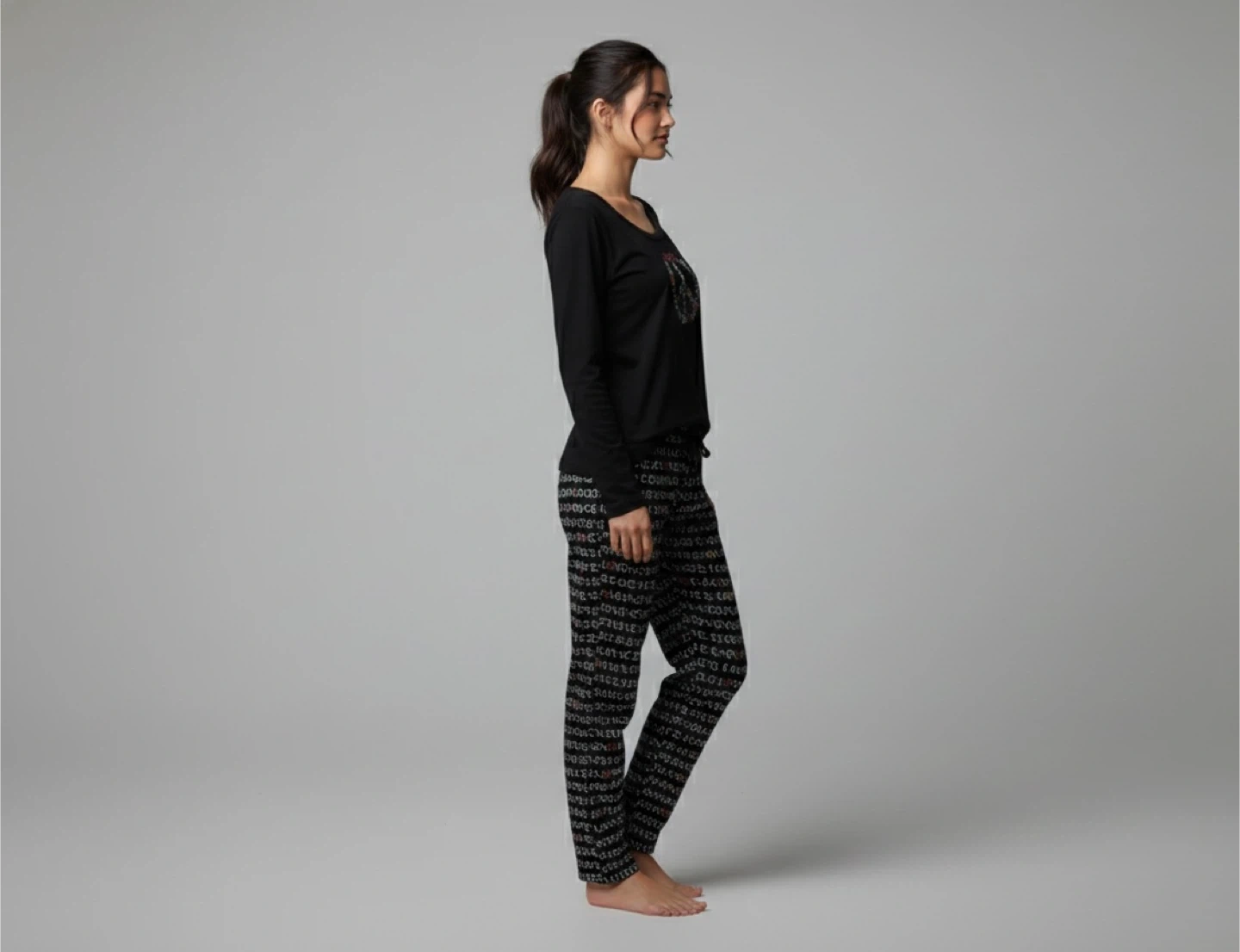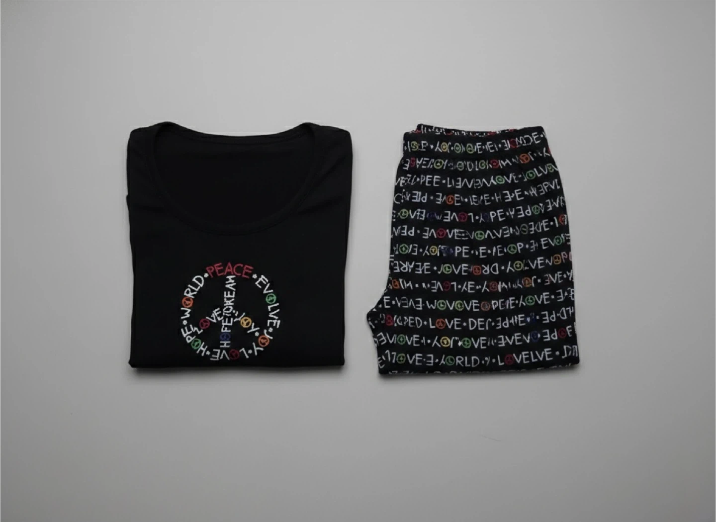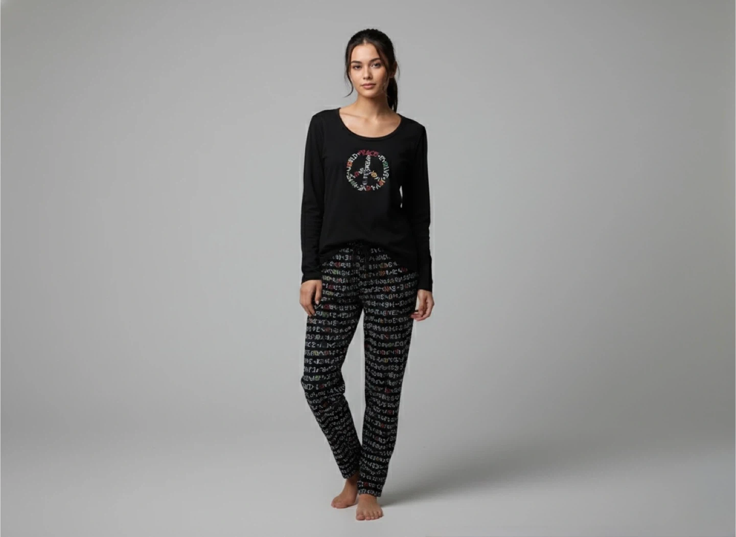 Comfy black pajama set with a long-sleeve top featuring a colourful peace symbol. The matching pants have a fun all-over print of positive words. Perfect for lounging or sleeping!