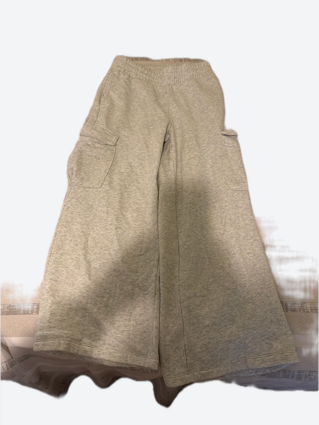 Comfy grey cargo sweatpants. Features an elastic waistband and two side pockets. These pants are made from a soft fleece material.