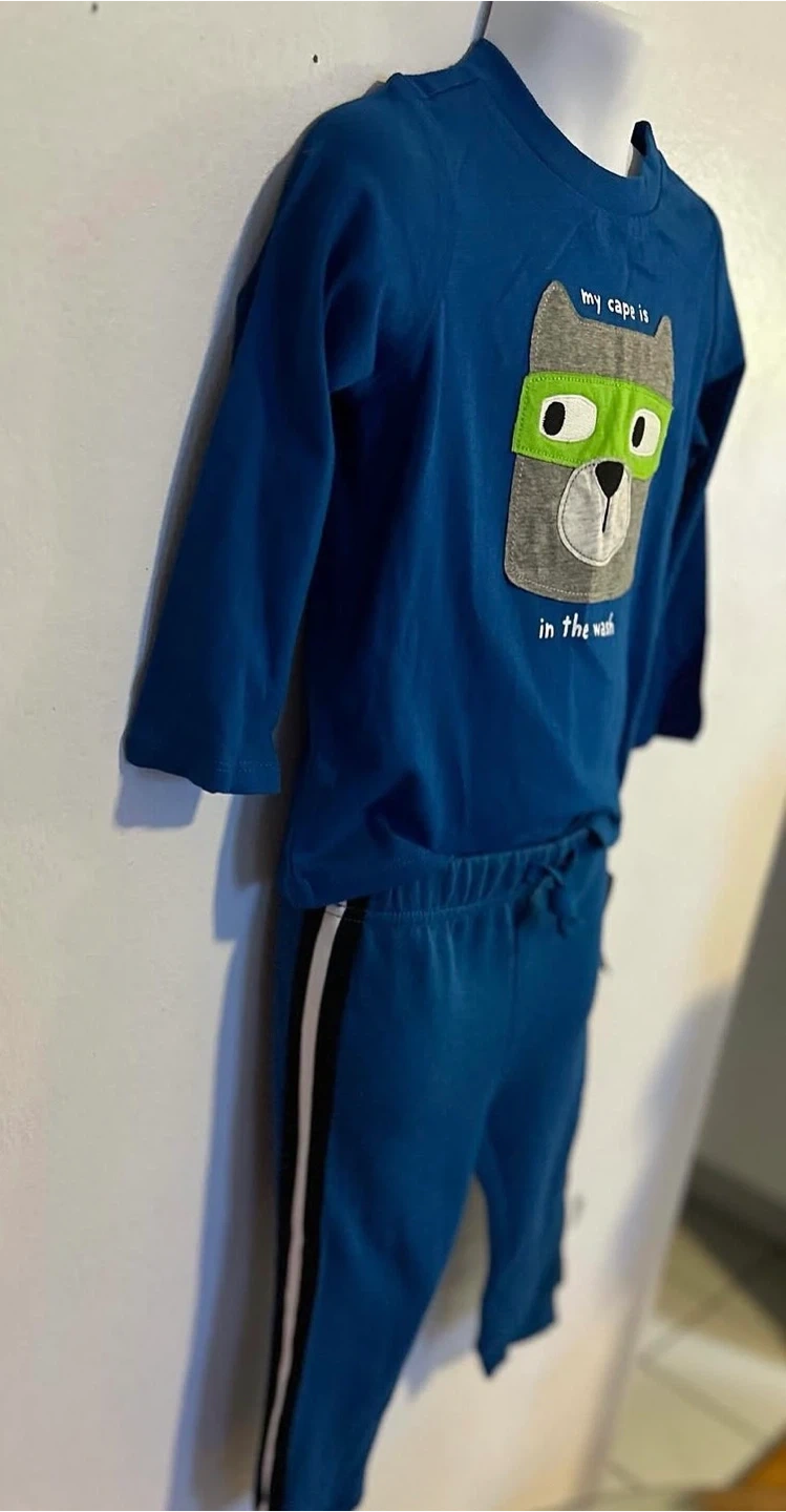 Cute Carter's long-sleeve shirt and pants set for kids. The shirt features a graphic of a bear with the text "my cape is in the wash". Pants have a drawstring waist and a black stripe down the side. Made from a soft cotton blend.