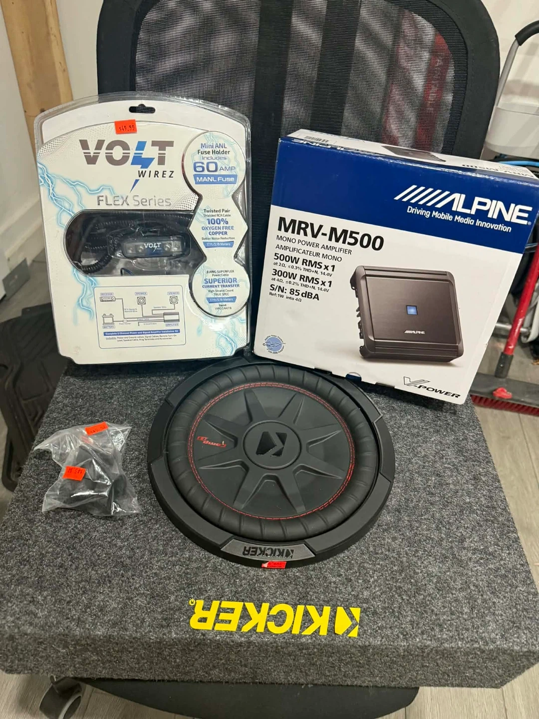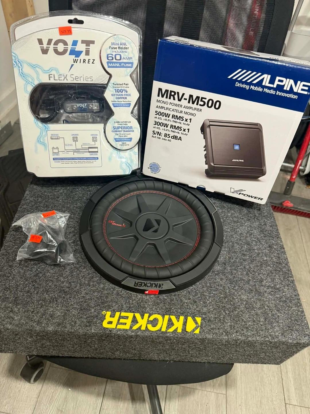 This is a package deal including an Alpine MRV-M500 mono power amplifier, a Kicker subwoofer, and a Volt Wirez Flex Series mini ANL fuse holder. The amplifier is rated at 500W RMS x 1 at 2 ohms. The fuse holder is 60 AMP.