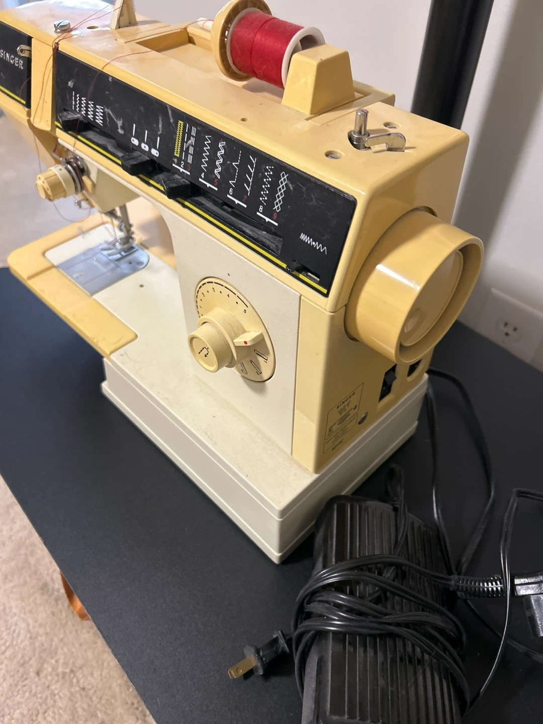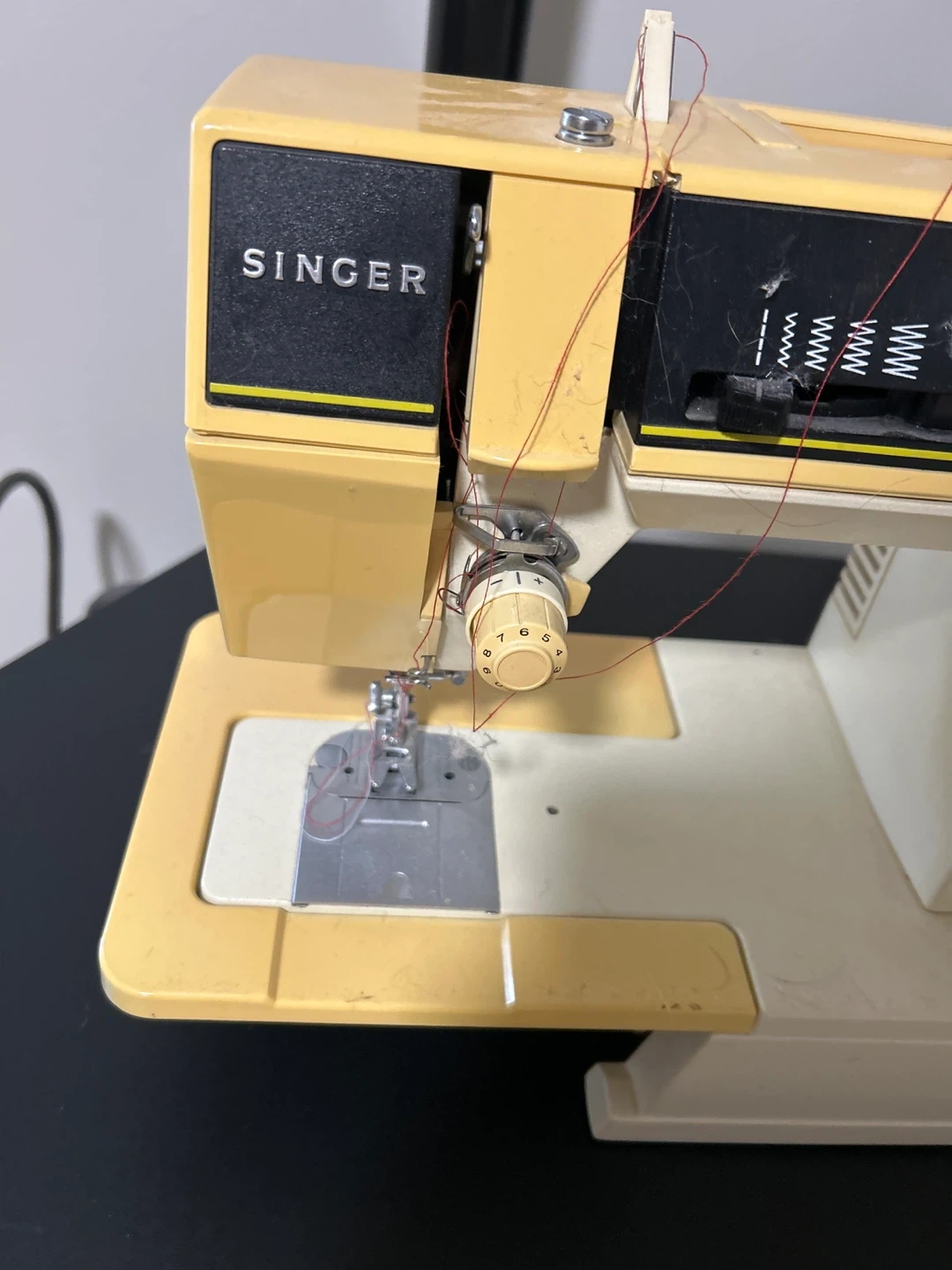 This is a vintage Singer sewing machine. It's yellow and cream coloured. Comesthread. It has multiple stitch patterns available for different sewing needs.