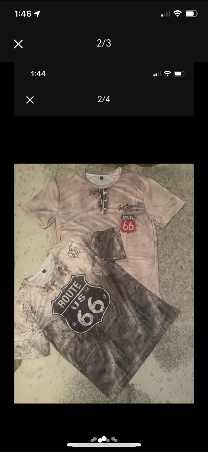 Two graphic t-shirts featuring the iconic Route 66 logo. These tees have a distressed map-like print. They're made for a comfortable, casual look.