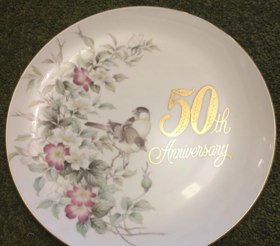 Selling a lovely Saji Fine China plate commemorating a 50th Anniversary. The plate features delicate floral designs and birds, with gold lettering and gold trim. A beautiful piece for collectors or as a decorative item!
