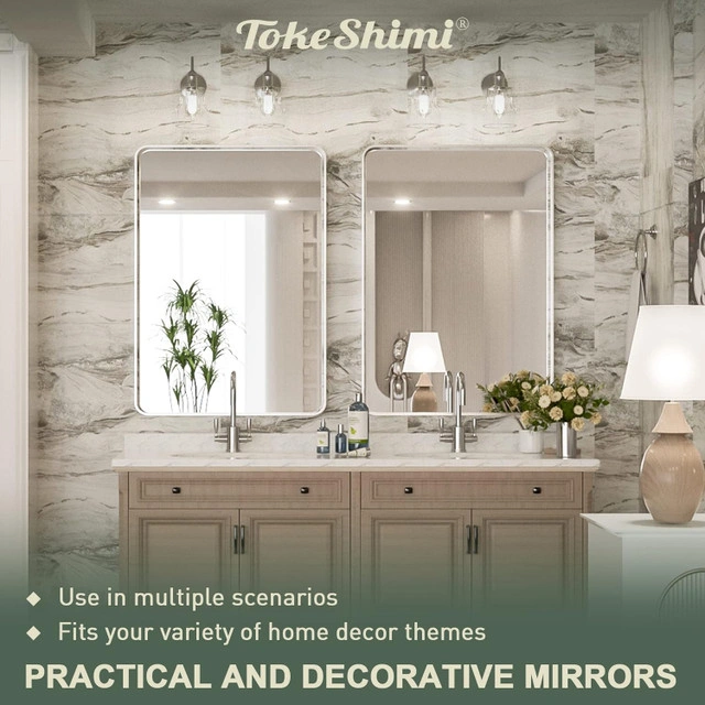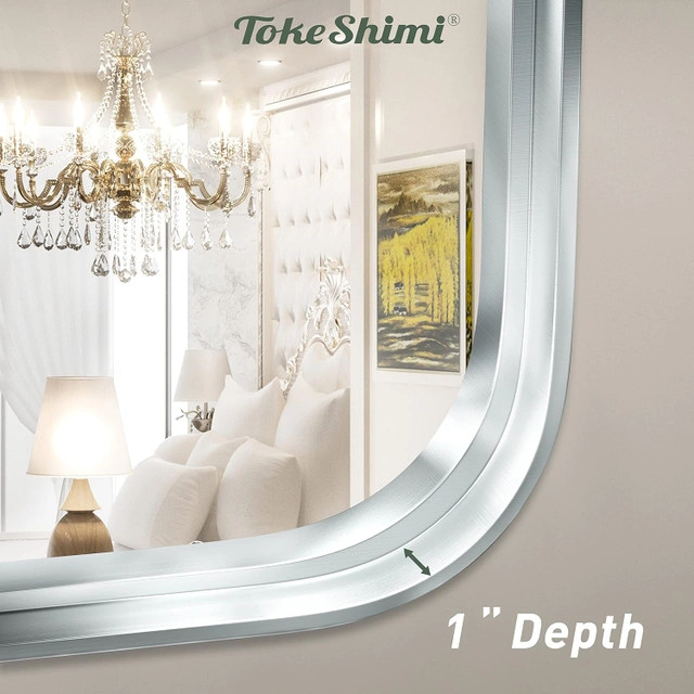 Brand new mirror. It comes in original box with mounting hardware. Retails at Amazon for $181 ($160 + tax). Save your money. Pickup from south London. TokeShimi 24 x 36 Inch Brushed Silver Bathroom Mirror for Wall Brushed Brass Metal Rounded Corner Rectangle Mirror Metal Frame Deep Set Design Hangs Horizontal Or Vertical Product details: Brand: TokeShimi Room type: Bathroom Shape: Rectangular Product Dimensions: 60L x 91W Centimetres Frame material: Aluminum Style: Modern ❥NON-RUSTING BRUSHED SILVER ALUMINUM ALLOY METAL FRAME MIRRO : Durable aluminum alloy combines with oxidation process makes brushed silver frame with unique brush/matte texture, more metallic, non-deformed and non-rusting and more More durable. Will not rust in wet environments. Horizontal/Vertical installation. ❥PRACTICAL AND DECORATIVE ROUNDED CORNER RECTANGLE MIRRORS: DIMENSION (24×36 inch, 0.8 inch depth, 2 inch thickness). Fit in All Kinds of Home Deco.TokeShimi silver vanity mirror has modern, minimalist, farmhouse and industrial style appearance which is the prefect addition to your bathroom, powder room, dining room, living room, hall, etc. ❥STURDY PACKAGE WITH 3 LAYERS FOAM :Tokeshimi brozne farmhouse mirror is secured with customized 3 layer foam in carton box passed all rigorous tests including dropping, impact test which is very sturdy and make sure to provide mirrors in perfect condition for you. ❥HD REFECTION AND 5MM SHATTERPROOF GLASS:Tokeshimi mirror adopts 5-layer float technology to ensure 1:1 restoration of real image, no distortion, fast dispersion of fog and corrosion resistant and not easy to oxidize. Easy to clean.