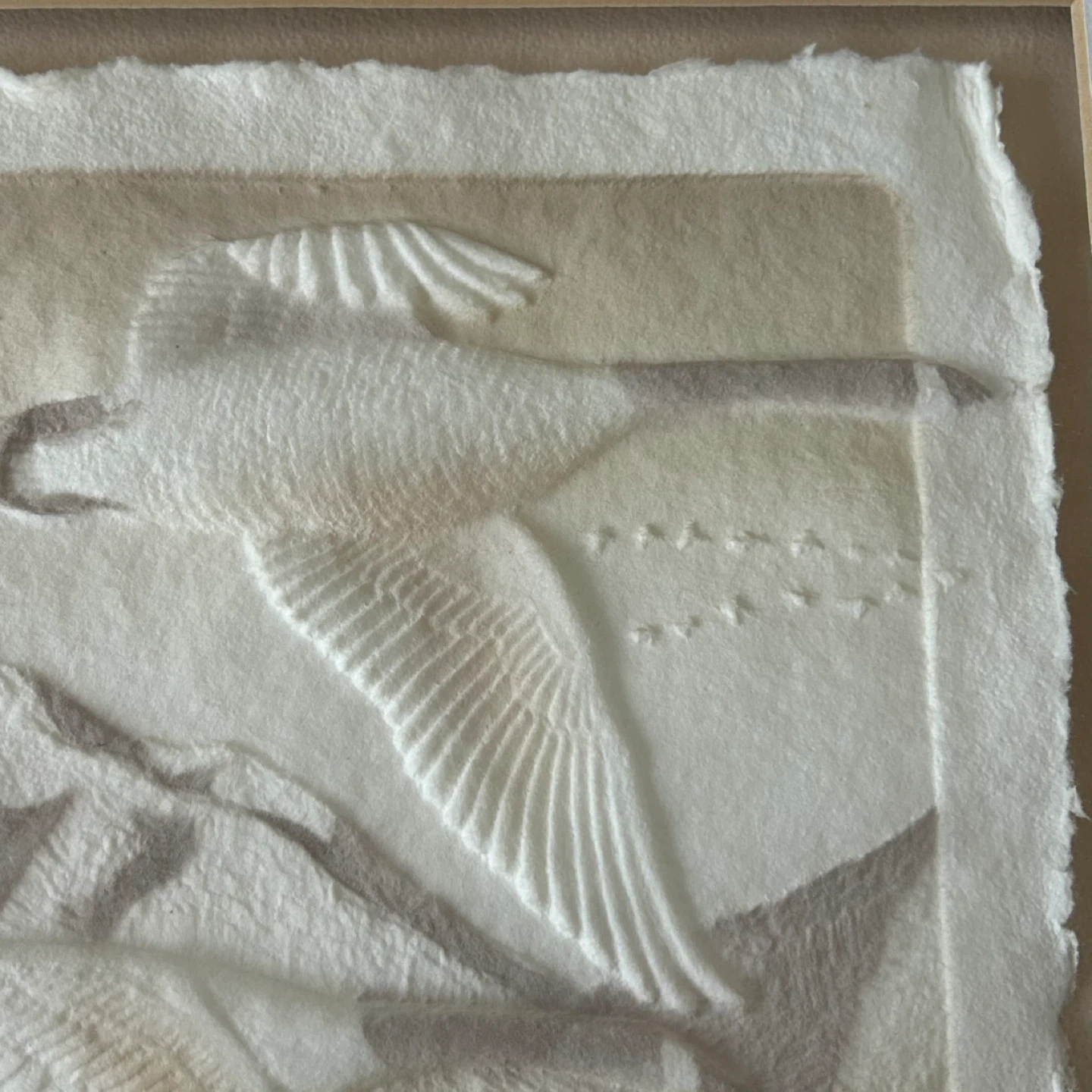 Beautiful vintage framed paper casting titled “Canada Geece”, featuring two Canada geese flying over a mountain landscape. The artwork has a wonderful raised, sculptural texture typical of quality cast paper art, giving the scene a subtle three-dimensional effect.
