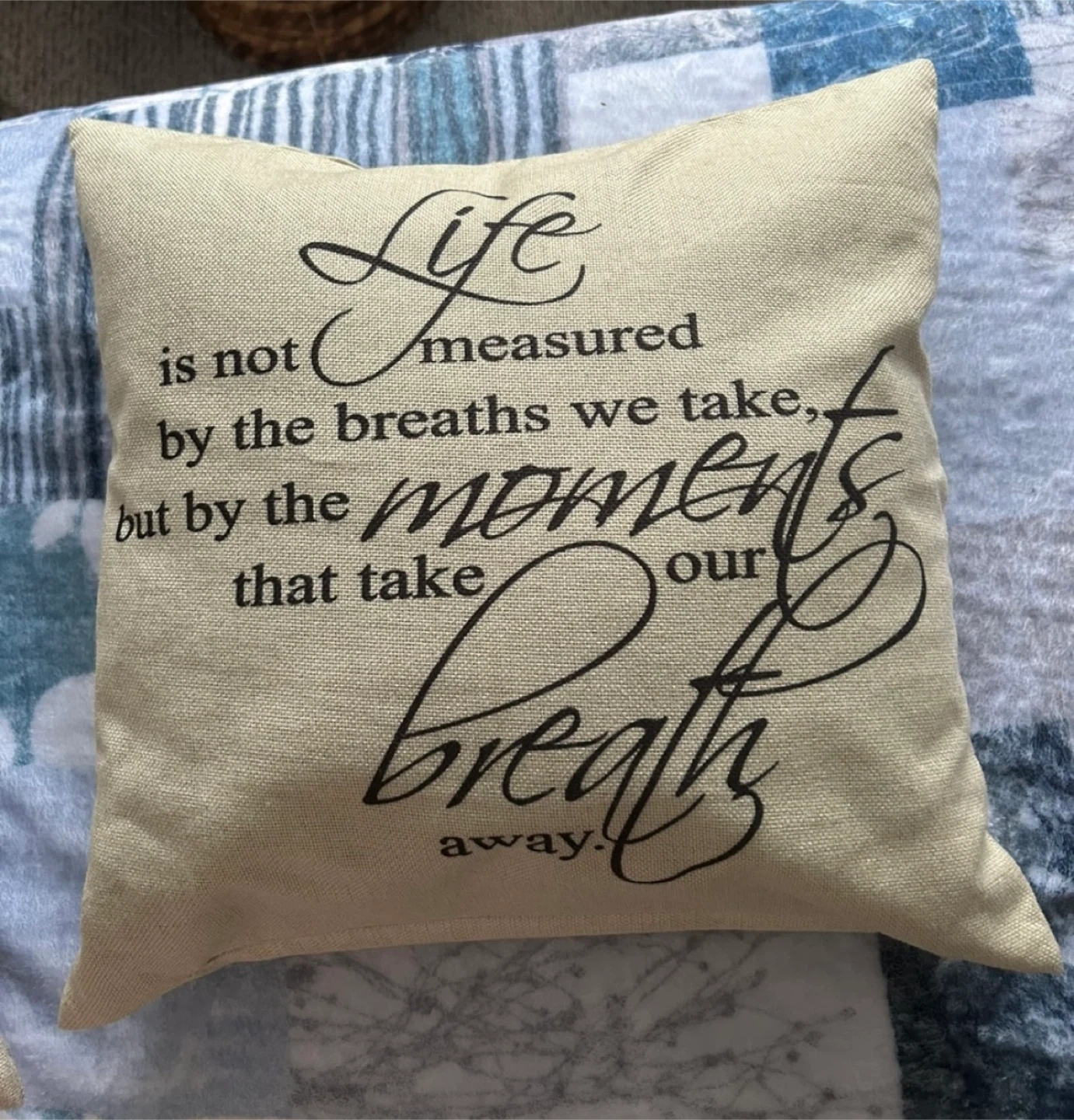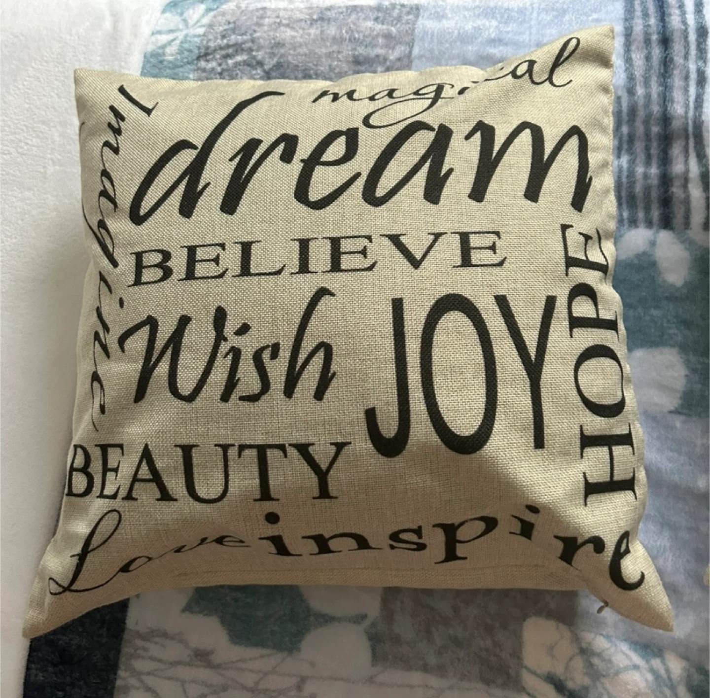 Two square throw pillow shams featuring a natural, linen fabric. It showcases inspirational quotes and sayings in a stylish font. It's perfect for adding a touch of warmth and positivity to any room.