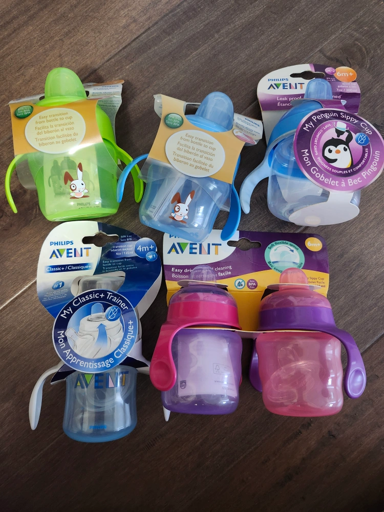 Selling a collection of Philips Avent sippy cups for little ones! These are designed to make the transition from bottle to cup easy. They are BPA free and easy to clean. Perfect for babies aged 4-6 months and up!