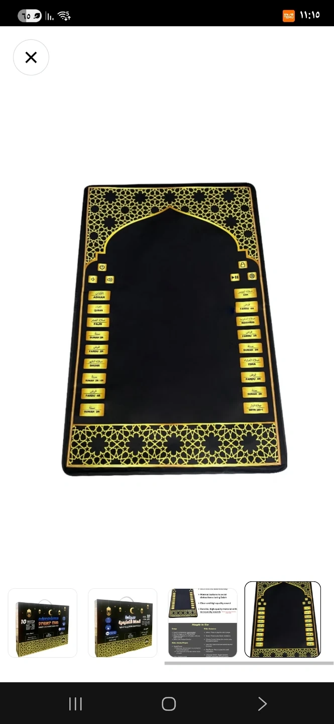 This smart prayer mat guides you through salat with illuminated keys and a built-in speaker. It features adjustable volume and playback controls. The mat displays prayer times and offers a complete Quran recitation. It's ideal for learning and performing prayers correctly!