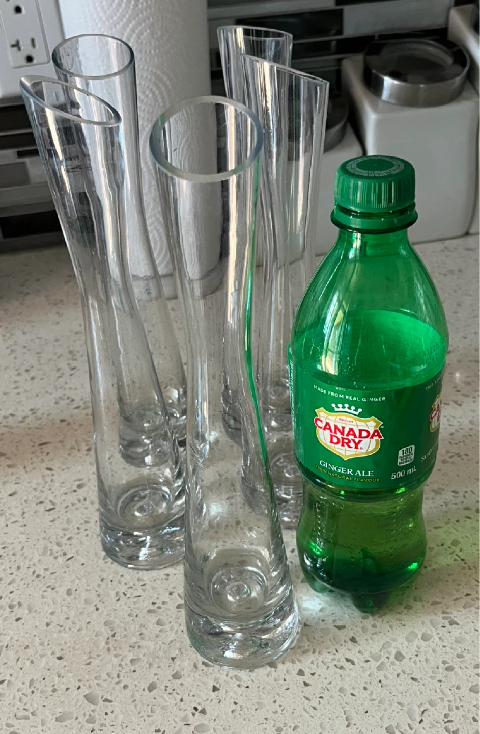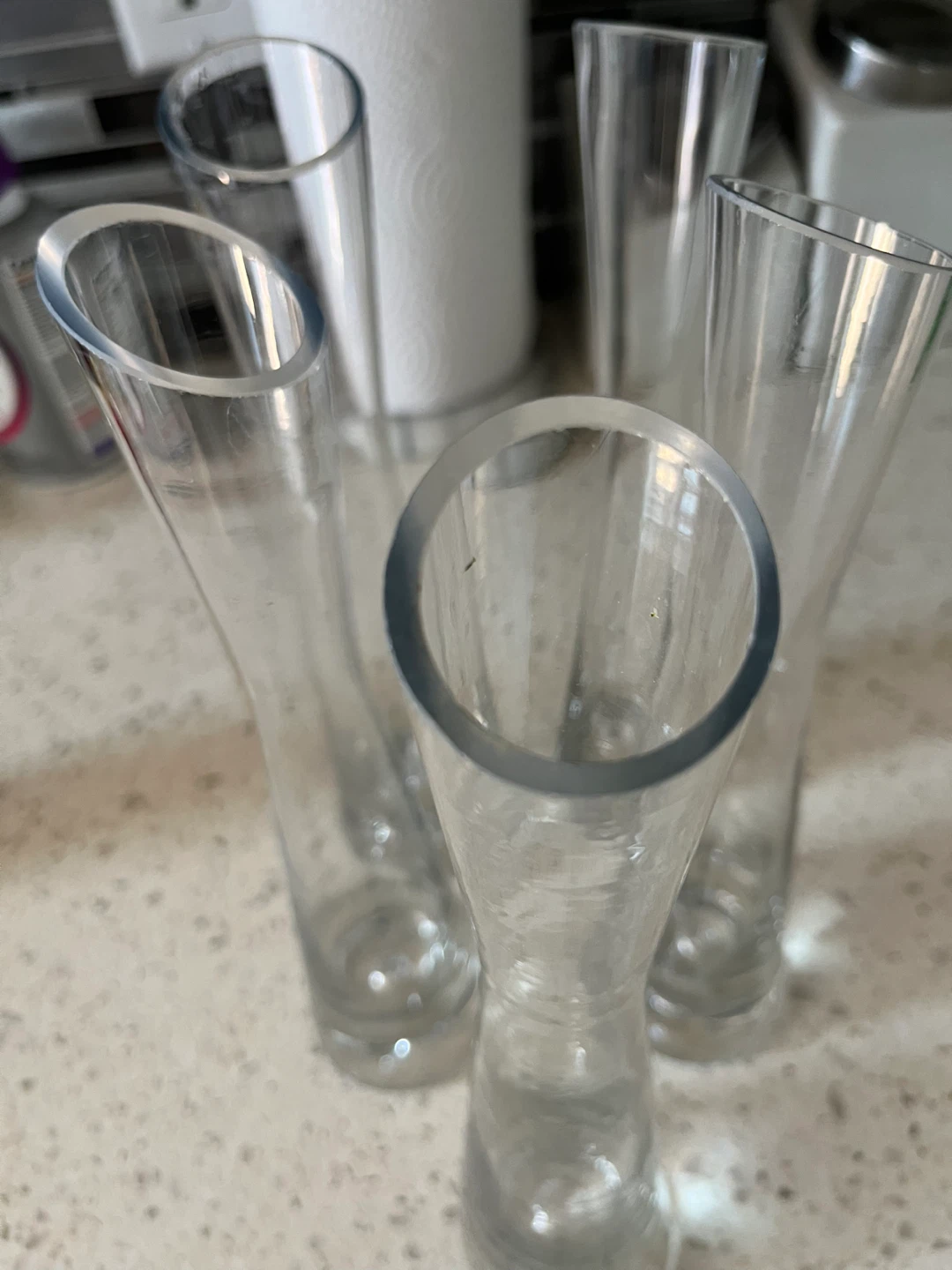 Selling a set of five clear glass bud vases. They're perfect for displaying single stems or small floral arrangements. They're in great shape and ready to brighten up your space!
